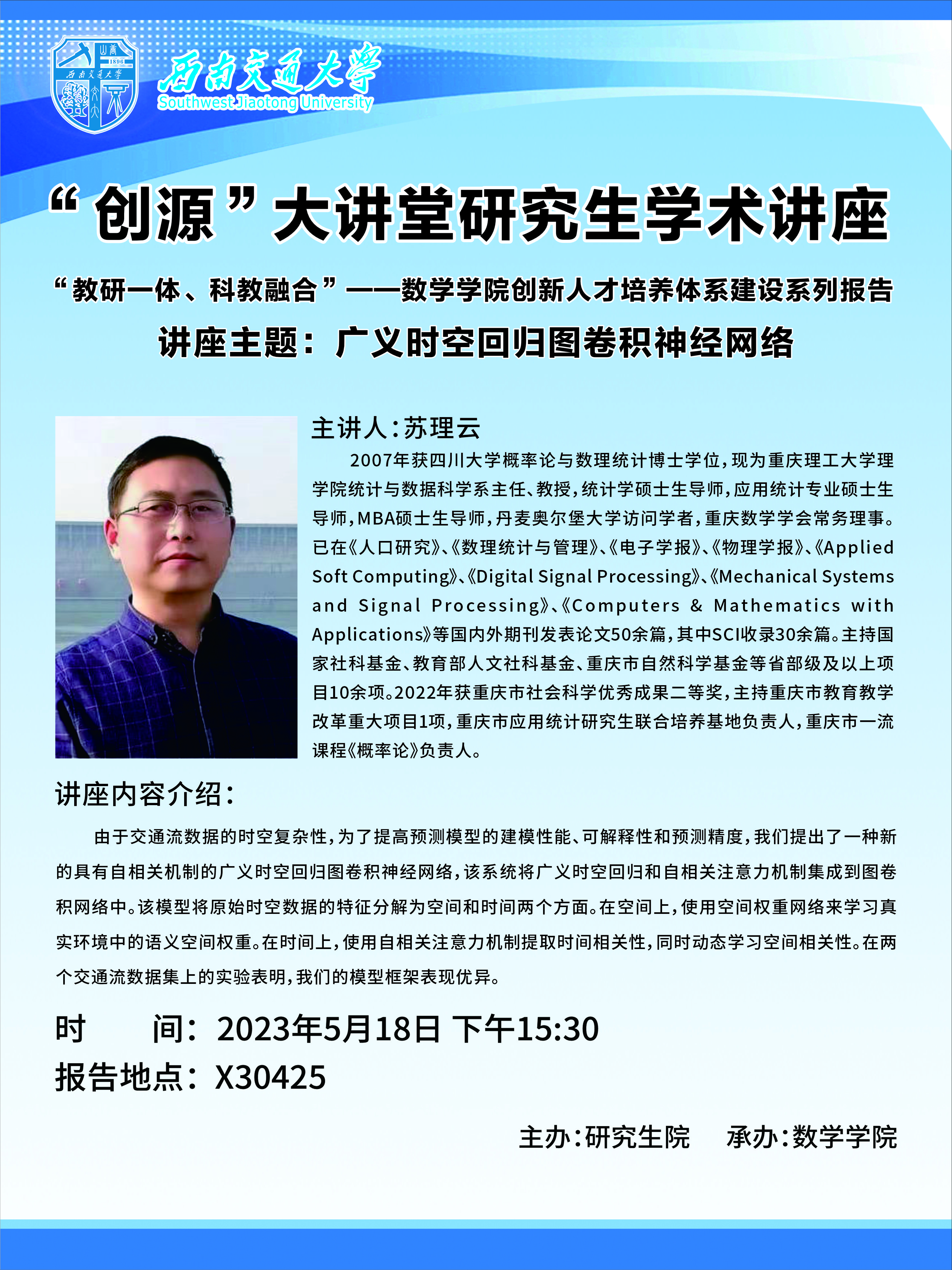 报告摘要:由于交通流数据的时空复杂性,为了提高预测模型的建模性能、可解释性和预测精度,我们提出了一种新的具有自相关机制的广义时空回归图卷积神经网络,该系统将广义时空回归和自相关注意力机制集成到图卷积网络中。该模型将原始时空数据的特征分解为空间和时间两个方面。在空间上,使用空间权重网络来学习真实环境中的语义空间权重。在时间上,使用自相关注意力机制提取时间相关性,同时动态学习空间相关性。在两个交通流数据集上的实验表明,我们的模型框架表现优异。