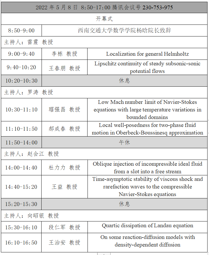 将于2022年5月8日以腾讯会议的方式举办“偏微分方程小型研讨会”。本次学术会议将以学术报告的形式围绕偏微分方程研究展开讨论,旨在深入探讨该领域的一些最新研究成果,同时促进 av解说