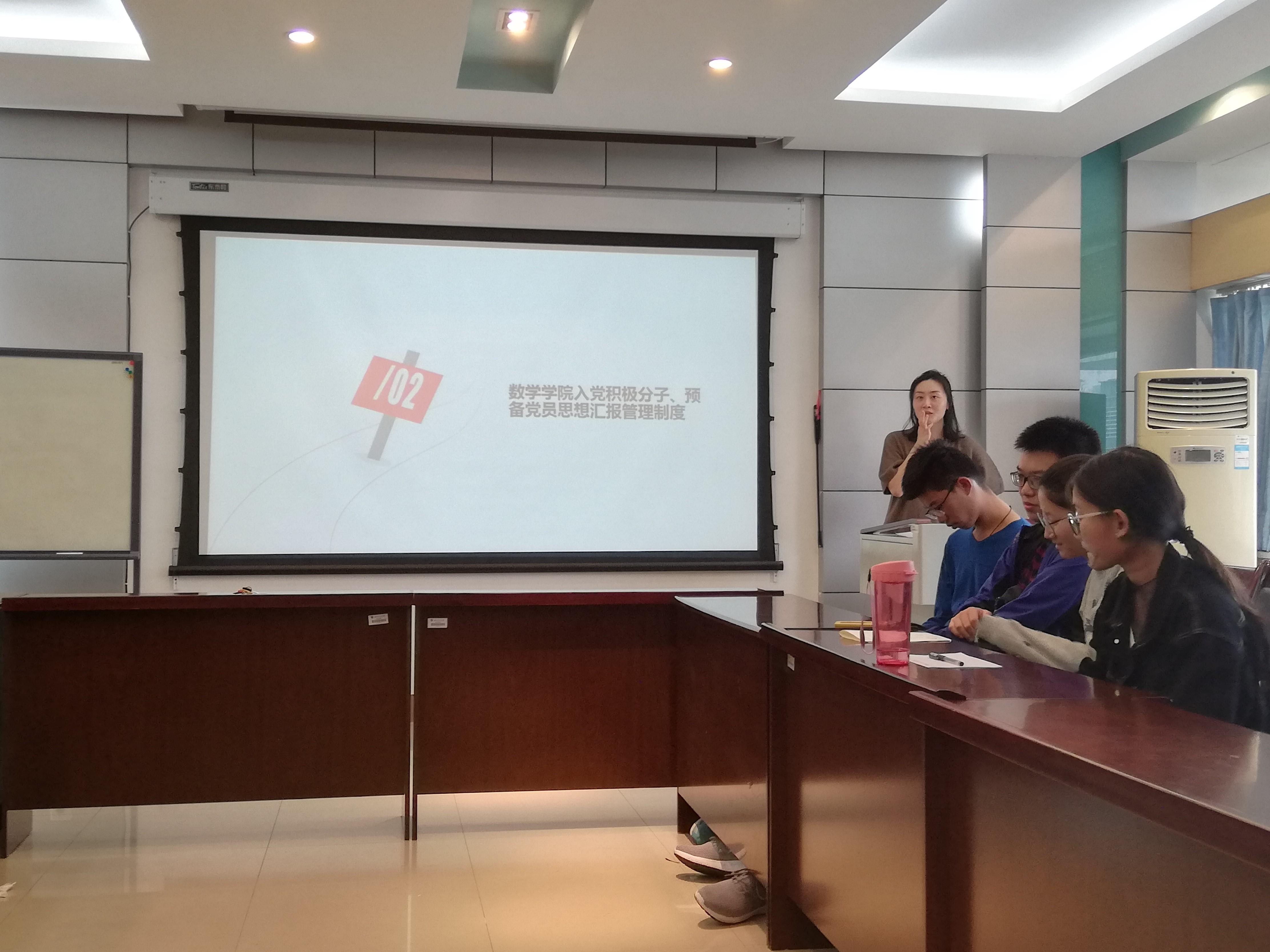 学工办主任兼学生党建指导老师卢怡帆老师主持,出席本次会议的有应数专业党支部书记孙昊,统计专业党支部书记张雁灵以及各班团支书和入党积极分子人员。