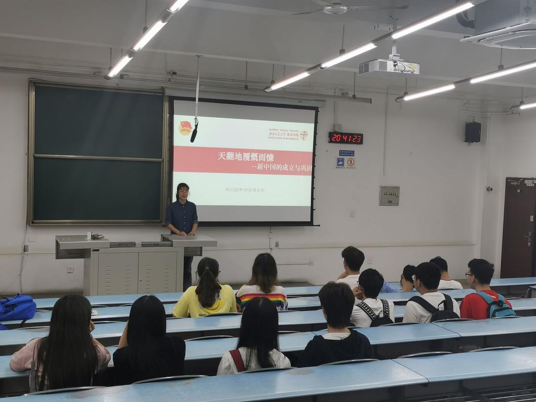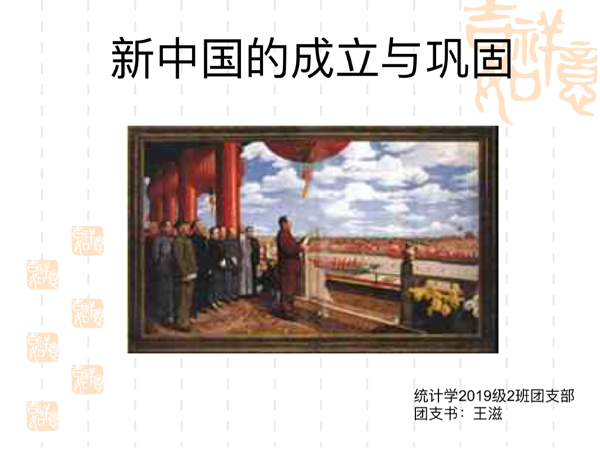 5月20日,统计2019-01团支部开展了以“新中国成立与巩固”为主题的党史学习会,通过PPT与视频相结合的方式进行了深度学习。学习观看了视频“开国大典,毛主席庄严宣布新中国成立”,重温了开国大典的盛况。紧接着,学习观看了视频“新中国的成立与巩固”,学习了中华人民共和国的成立过程;学习了西藏和平解放以及抗美援朝的历程;学习了《中华人民共和国土地改革法》,理解土地改革的意义。