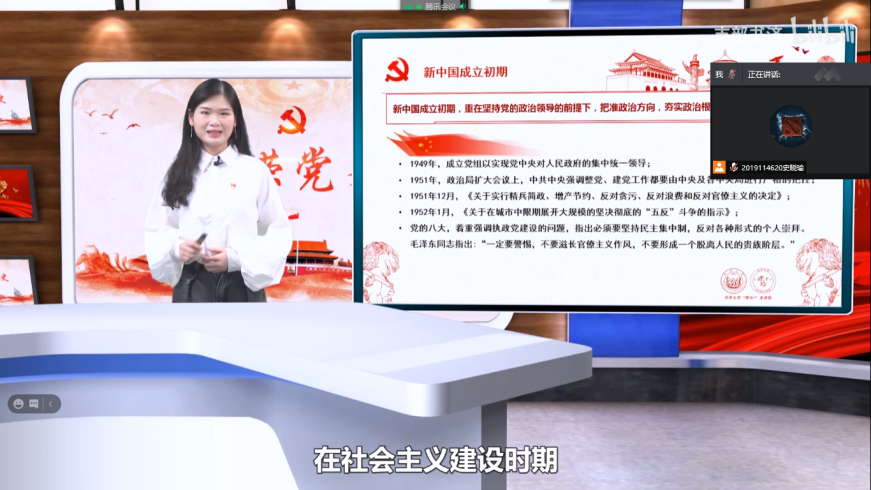 5月25日,数学2019-01团支部在腾讯会议线上开展了以“新中国的成立与巩固”为主题的党史学习会,观看了视频“峥嵘党史之政治建设史:新中国成立70周年来党的政治建设”。政治建设无疑是一个新兴国家巩固和发展最重要的部分,通过学习新中国成立初期党领导国家进行政治建设的风雨历程,同学们对新中国走的社会主义道路、今天中国社会主义建设的成就和未来中国