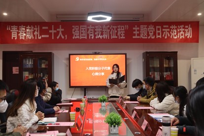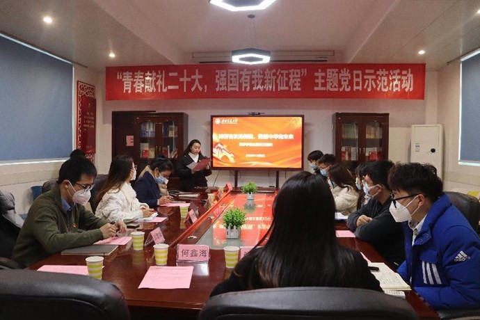 为深入学习贯彻习近平新时代中国特色社会主义思想和党的二十大精神,引导青年党员高举中国特色社会主义伟大旗帜,立足新时代新征程,坚定不移听党话、跟党走129日下午, av解说 开展踔厉奋发扬新貌,数耀中华向未来主题党日活动。 av解说 党委书记徐革、 av解说 团委书记邓思然、 av解说 党委专职组织员徐海晶、 av解说 学生工作组、22级研究生党支部、本科生党支部参与本次活动,22级研究生党支部书记郭悦主持本次活动。