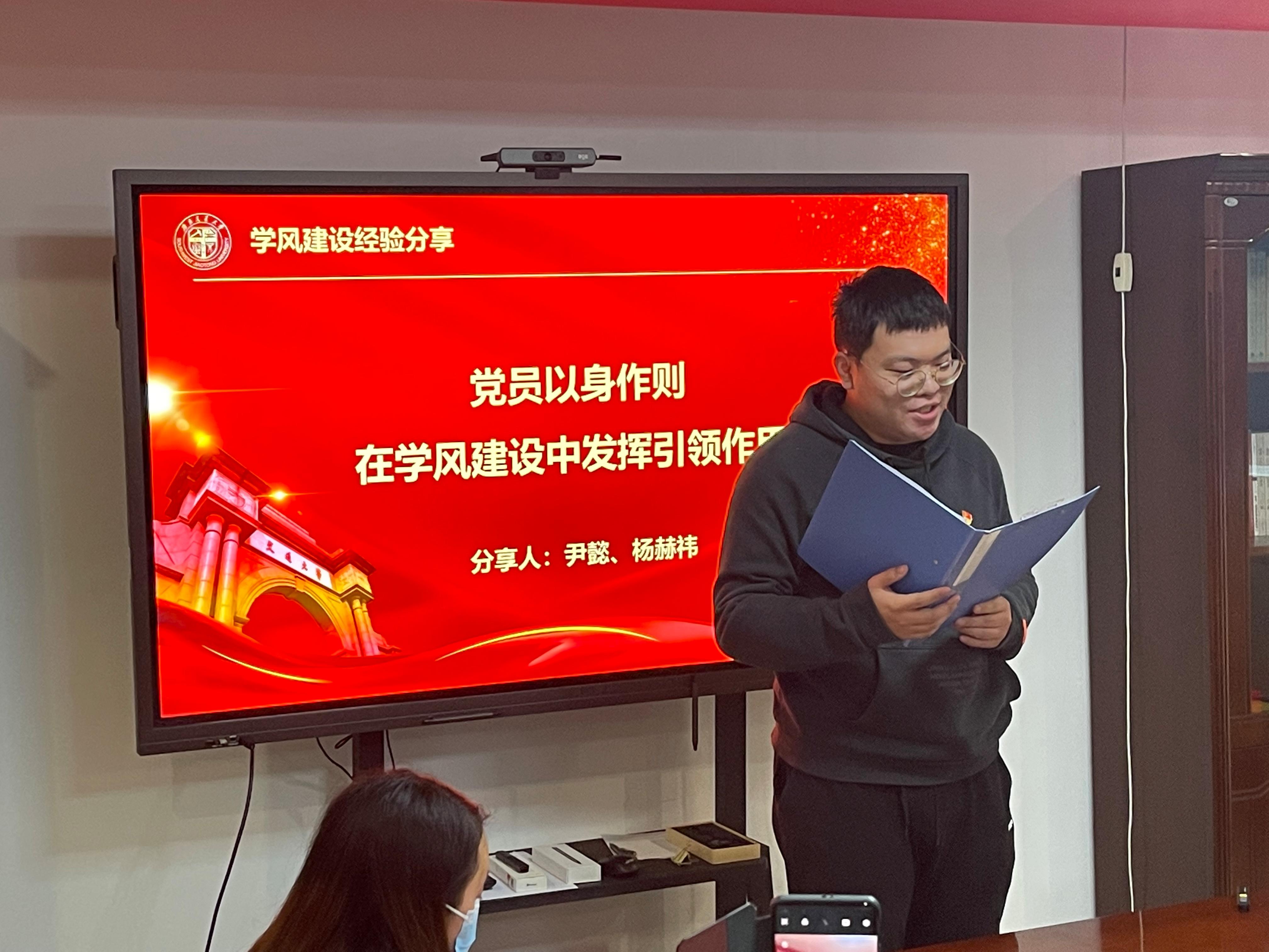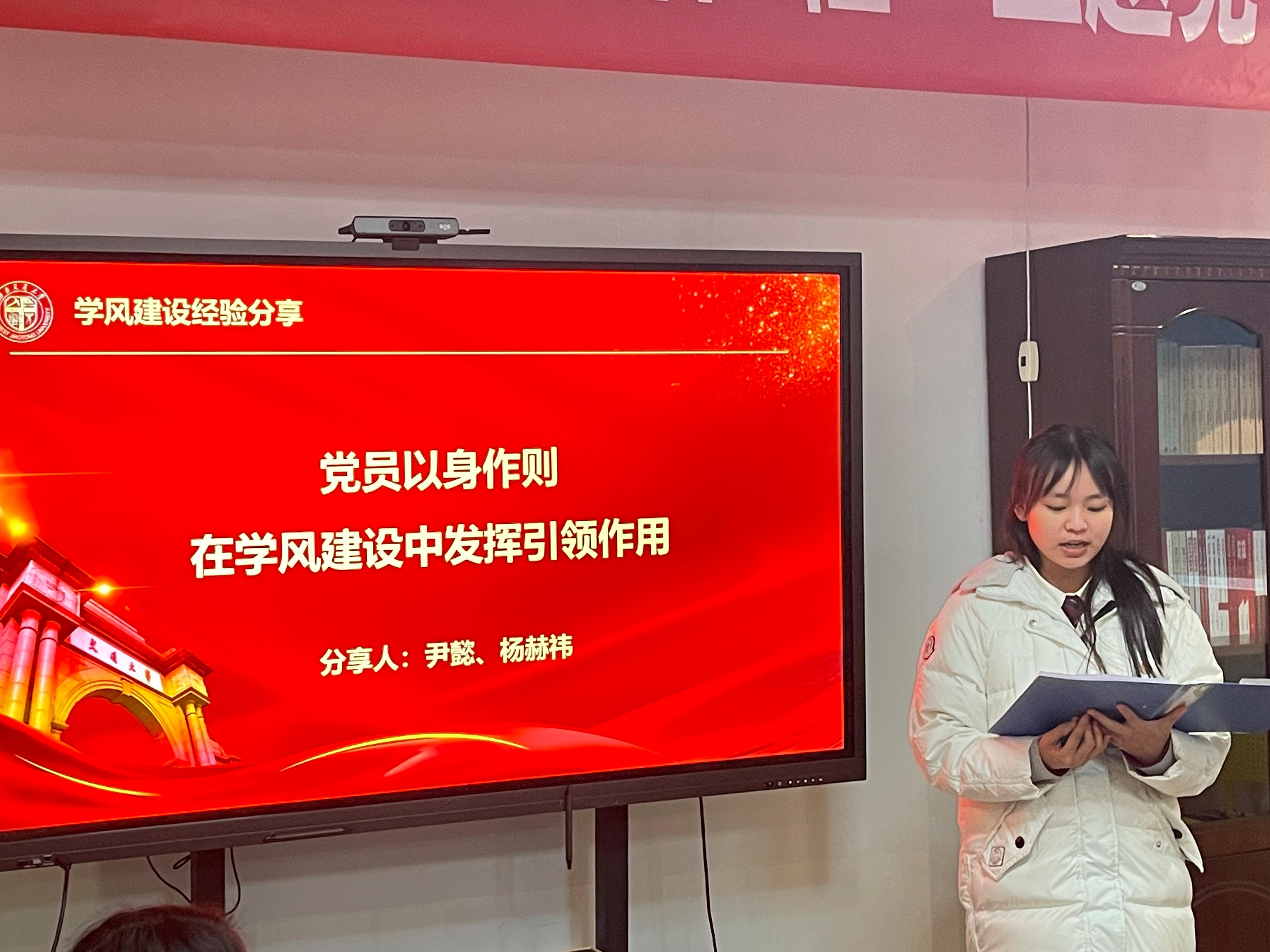 2名本科生党员代表分享学风建设经验。尹懿提到要发挥党员先锋模范作用,重视发挥党支部在 av解说 学风建设中发挥的引领作用;杨赫祎则主要谈及自己的科创经历,以身作则,主动担当,发挥党员作用为低年级同学举办专业介绍会等经验。