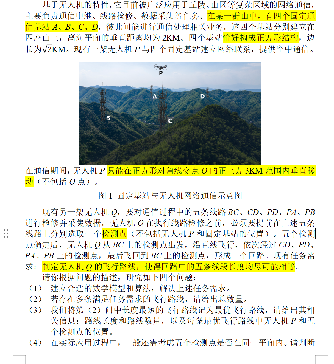 B题是一道“无人机最优飞行路线”则将场景转向三维空间中的路径规划问题。题目设定在一个由四个固定基站构成的立体通信网络中,要求为执行检修任务的无人机设计一条闭合飞行回路,其核心难点在于如何将“五条线段长度尽可能相等”这一抽象任务需求转化为精确的几何约束与空间搜索问题。求解此题需要扎实的空间解析几何知识、对对称性的敏锐洞察以及严谨的最优路径搜索算法,是一道几何与优化紧密结合的赛题。