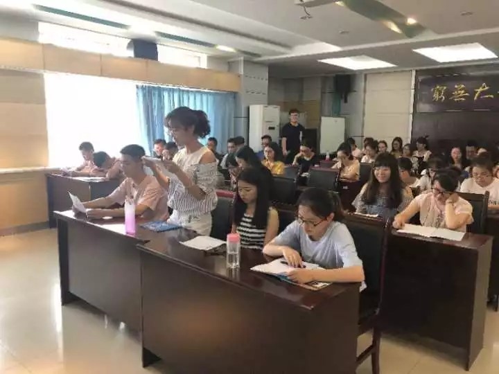 接下来,在钟老师的引导下,便是学习校歌阶段,由17届统计专业胡皓量与17届应数专业闵琮惠同学为18届数院新生教唱校歌。