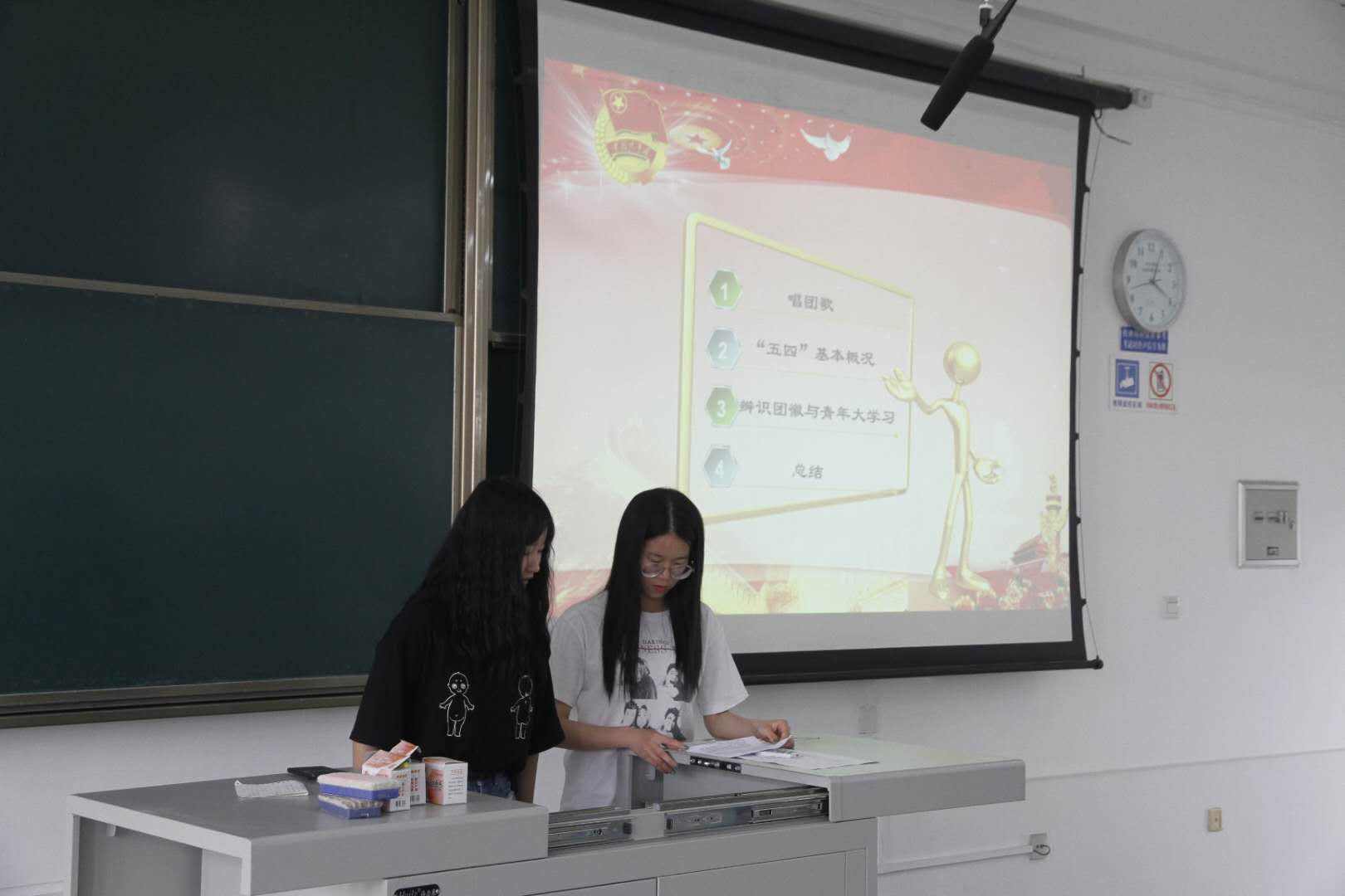 随后,邱灵同学讲述了团徽的内容及意义,并带领同学们从三个方面辨别正确的团徽,团徽的麦穗有12粒,团徽上面的字体是简体字并且团徽的颜色为正色。