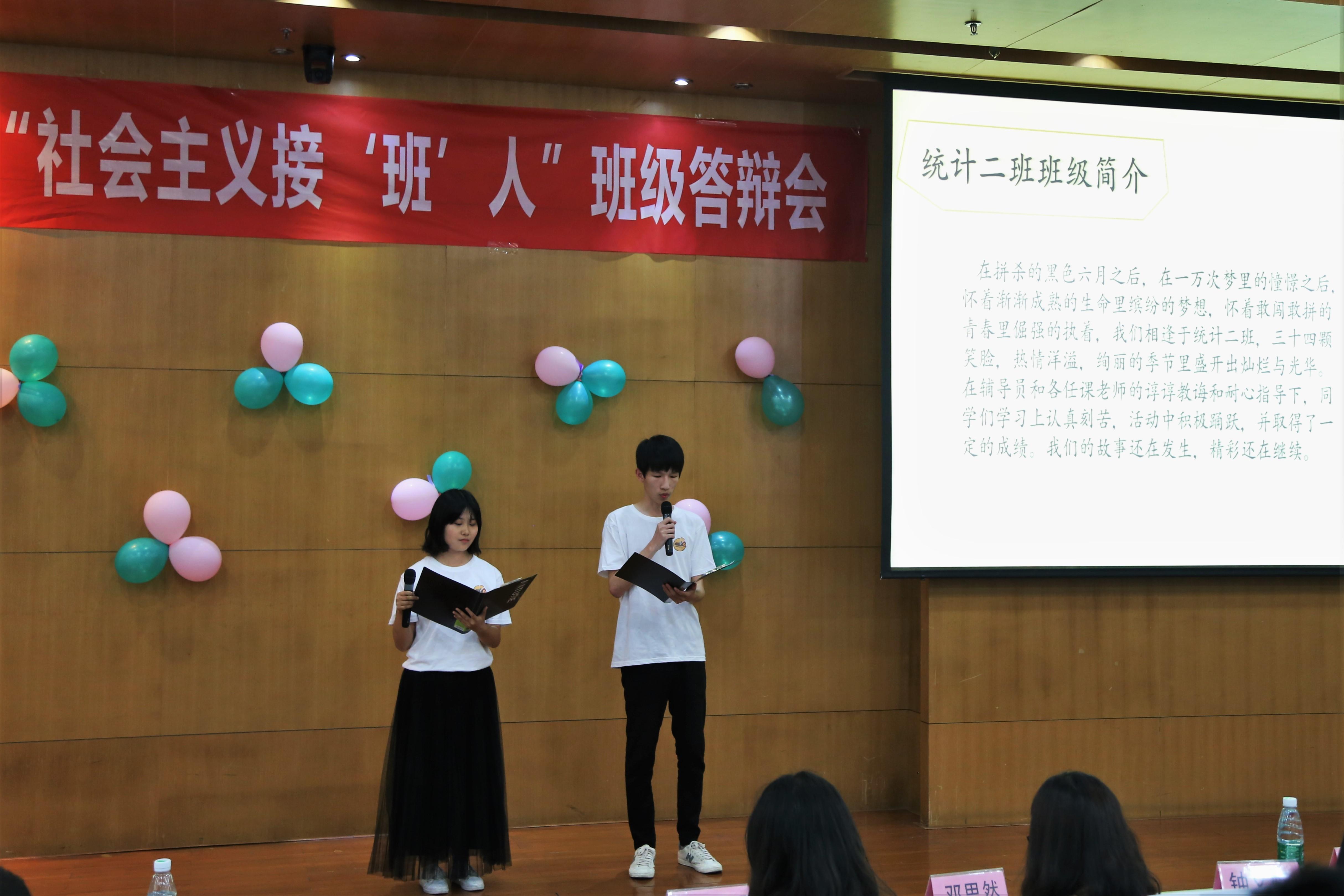统计二班是由34位同学组成的小天团,尽管他们有着不同的性格,不同的经历,但总能在关键时刻迸发出极大的能量。答辩人丁钰、陈余同学从班级简介,活动展示,班级荣誉等向我们展示了沉稳可爱的统计二班。伴着欢快吉他声,发光气球的有规律的摆动,统计二班的同学带来青春飞扬的歌声,一首青春纪念册唱出了他们的朝气。“精于数分,勤于高代,力挫群雄,唯我统二”,他们精彩的故事仍在继续。