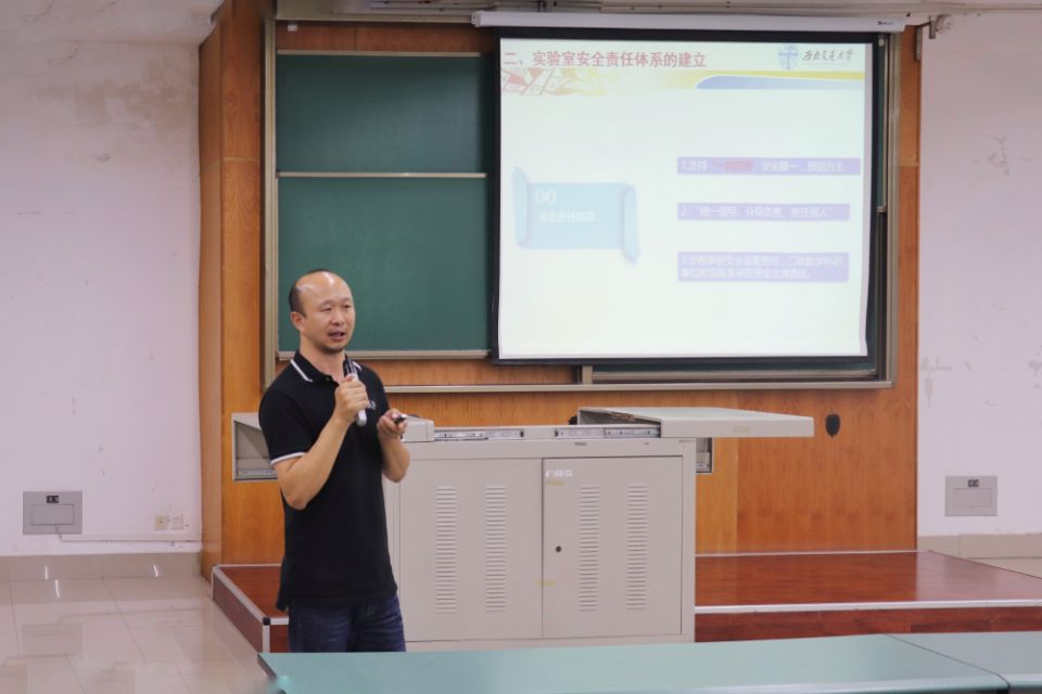 在X4350开展了2019级新生实验室安全教育活动。本次讲座由理学博士兼硕士生导师潘志刚主讲。