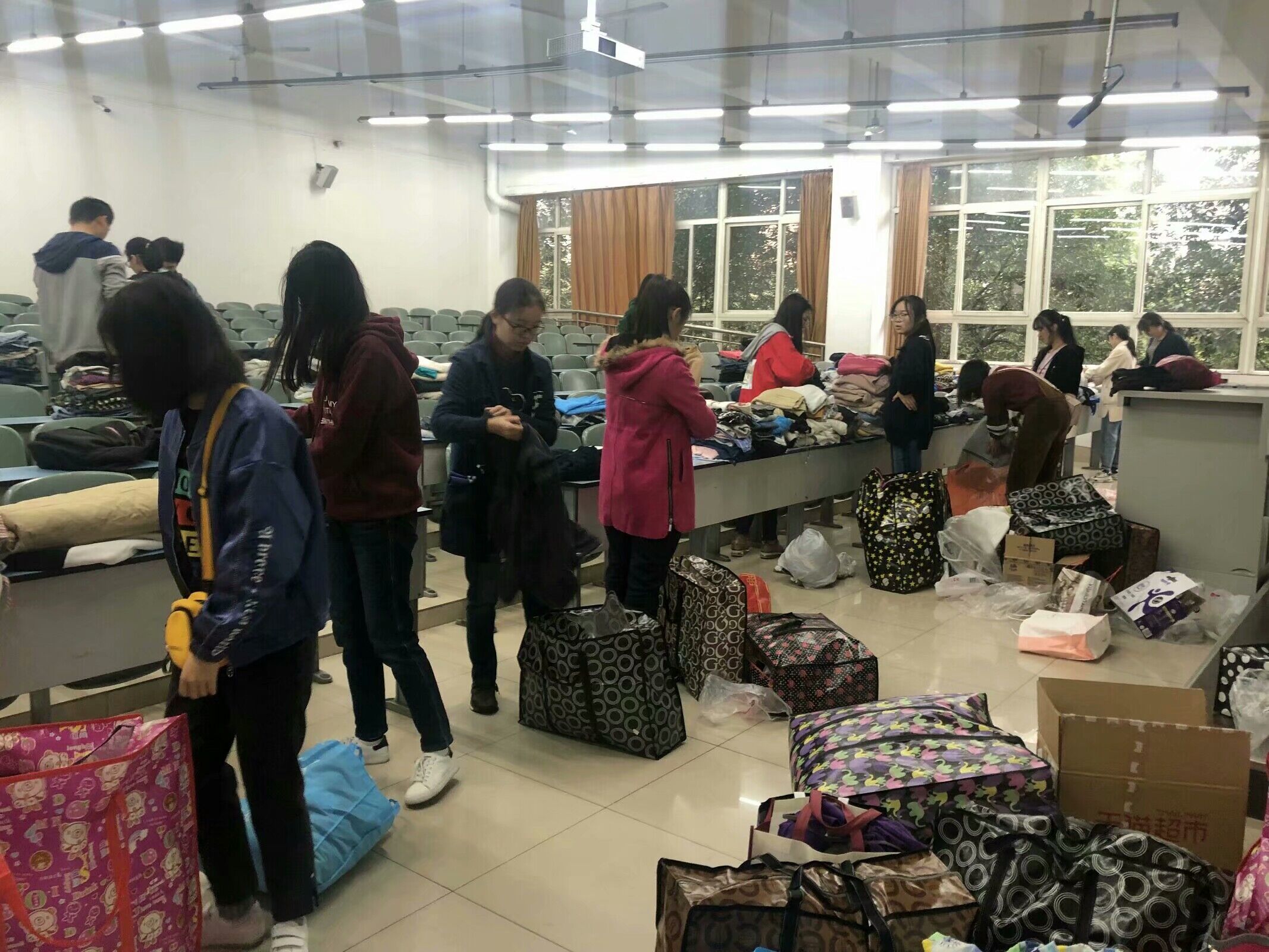11月7日和11月8日晚上9点至10点,志愿者们带着编织袋开始了接收衣物之行。同学们为了方便志愿者们收集衣物,将自己的衣物提前用纸箱装好放在门口。虽然提着编织袋不停地穿梭在宿舍楼之间身体会有些疲惫,但是看着那逐渐被衣物装满的袋子,大家心里充满了动力。衣物收集工作结束后,志愿者们将衣物统一放于一处进行保管。