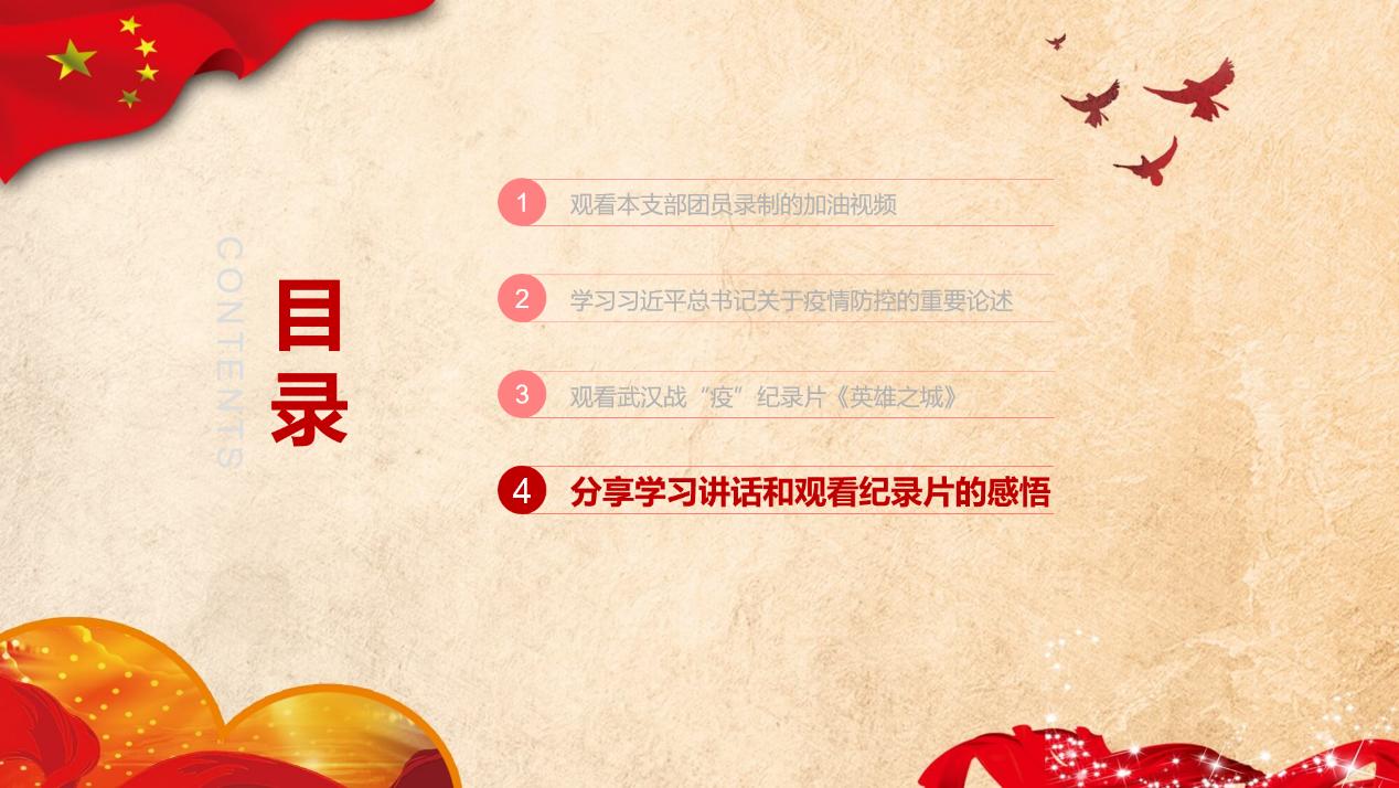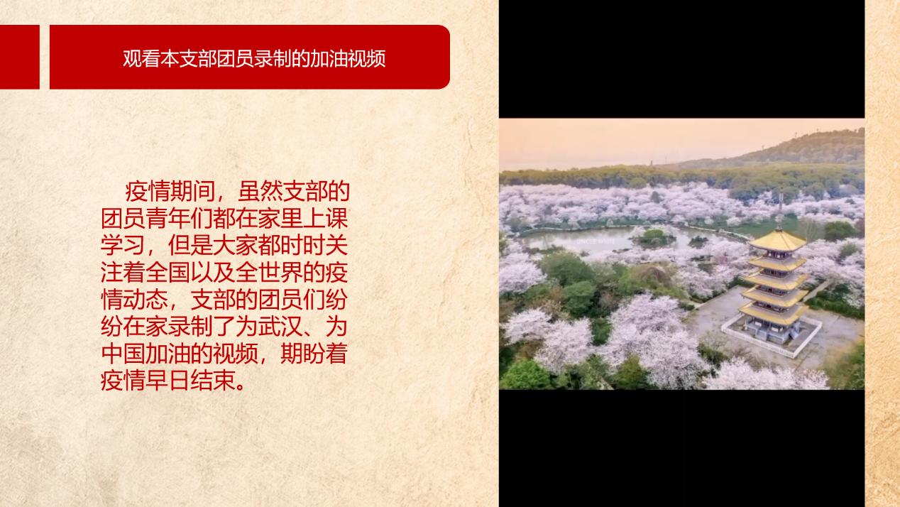 活动的第三部分内容是团员们共同观看武汉战“疫”纪录片《英雄之城》。这部央视拍摄的纪录片讲述了在武汉发生的战“疫”故事。观看过后,每位团员都对奋斗在抗疫一线的战士心生敬佩。我们衷心期待武汉早日恢复往日的生气,衷心祝福感染新型冠状病毒的肺炎患者能早日康复。