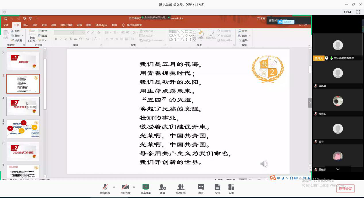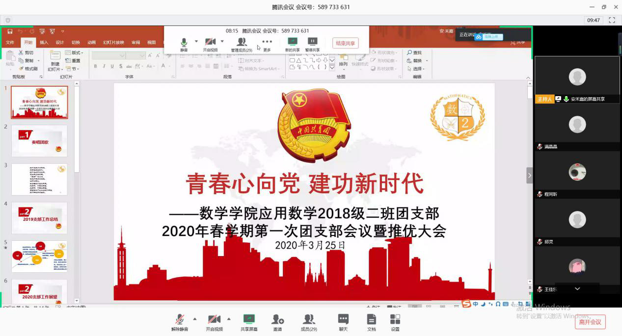 应用数学2018级2班团支部于3月25日开展了2020年春学期第一次团员大会暨积极分子推优大会。大会主题为“青春心向党·建功新时代”,由团支书邱灵、副团支书安禾嘉主持。除特殊情况外,支部全体团员参加会议。团支部“1+100”负责人, av解说