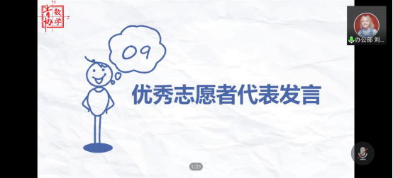 由于疫情防控需要,本次总结大会于线上通过腾讯会议开展。大会首先由主持人杨茗茜和余昊屹介绍到场嘉宾,然后由数学青协指导老师王亚梅老师致辞。王亚梅老师强调了“保持初心”对每一位青协成员的重要性,并提出要学会反思总结,鼓励成员继续奋斗、不断提升工作态度与工作方法。