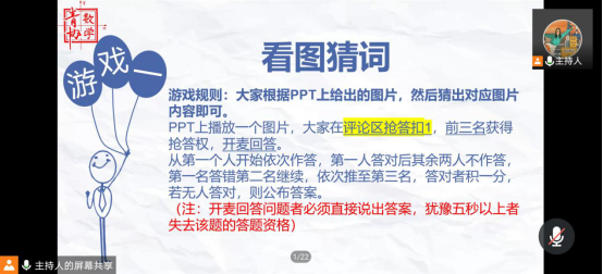 然后是游戏环节——看图猜词。第一部分是太极招式猜猜猜,同学们根据卡通图片展示的太极招式,猜测招式名称。第二部分是汉字猜猜猜:根据象形文字猜测其对应的现代汉字。成员们通过这一游戏感受到了汉字的深厚历史与迷人魅力。