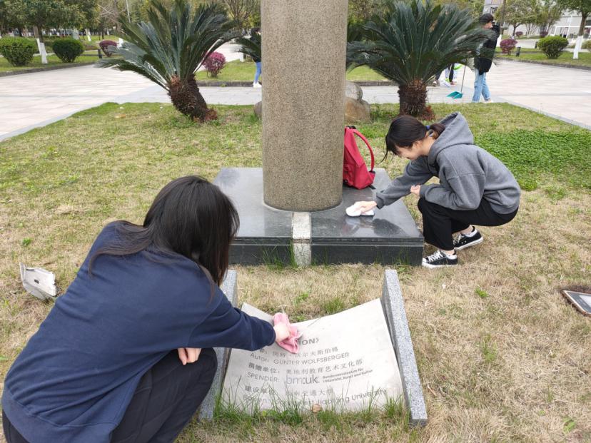 分组一的同学擦拭了石碑,同时也把草坪上的一些杂物给扫除。