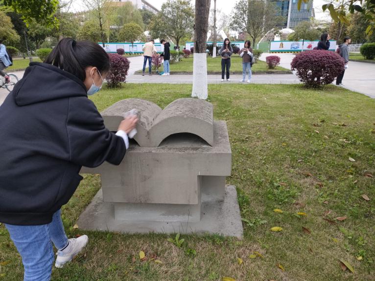 分组二的同学擦拭了雕像。
