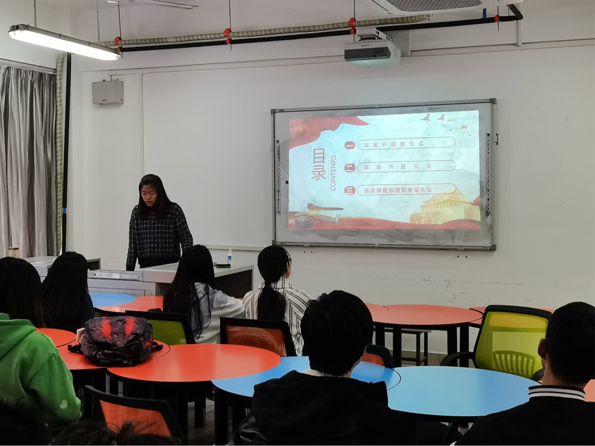 接着,团支部书记黄玉欣以ppt的形式为大家介绍并讲解了国旗的使用场合、国歌的奏唱礼仪以及国徽的礼仪,并以此号召大家把握新机遇、建功新时代、坚定理想信念、站稳人民立场、练就过硬本领、投身强国伟业,充分展现作为青年突击队中的一员的作用。团支部书记黄玉欣号召大家要听从党的号召,不负历史使命,紧跟时代砥砺前行,担当责任奋发有为,让青春在为祖国、为人民、为民族的奉献中焕发出绚丽的光彩,在矢志奋斗中谱写新时代青春之歌。