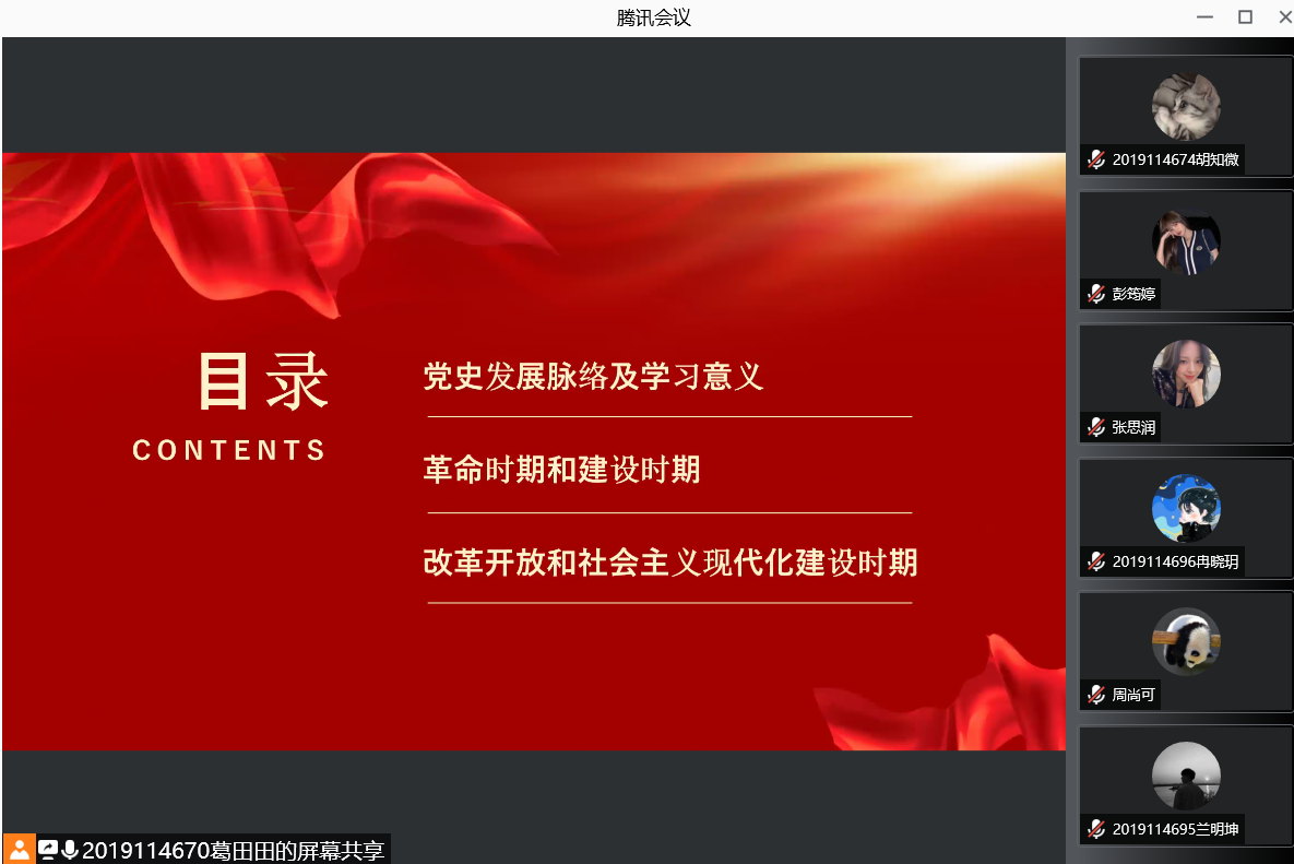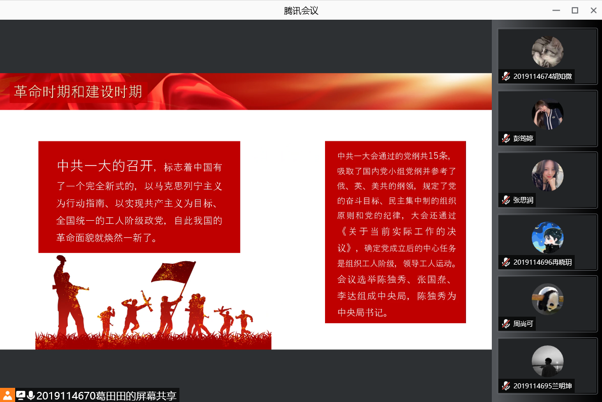 在10月22日晚七点,19级统计一班召开了主题为“热烈庆祝中国共产党成立100周年”的秋季开学第一堂团课。会上,团支书与同学们共同回顾了中国共产党走过的百年历程,了解了当前我们党的历史任务,并结合青年人在国家社会发展中的重要作用,展望了未来的国家发展前景。