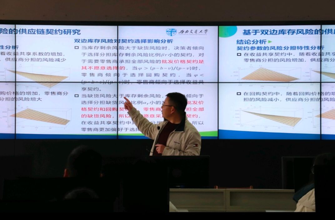 ,蹇明教授为同学们讲解了基于双边库存风险的供应链契约研究,他通过成都实际烟草调度配置问题,让同学们感受到大数据在未来研究中的价值,并且切身体会到了数学在其中的重要性。