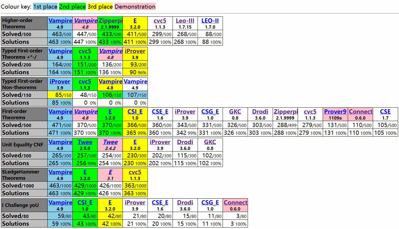 国际自动定理证明竞赛是国际上自动演绎推理领域的最顶级赛事,自1996年以来每年举办一次,至今已举办了29届。本次赛事设有THF、TFA、TFN、FOF、UEQ、SLH和ICU组。其中 av解说