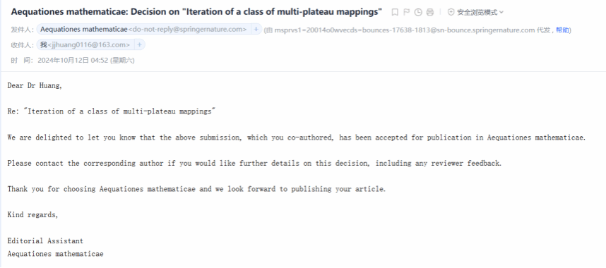 的张佳玲博士。期刊《Aequationes mathematicae》首次出版于1968年,专注于纯数学和应用数学,强调函数方程、动力系统、迭代理论、组合数学和几何等领域。目前该期刊为中科院三区期刊。