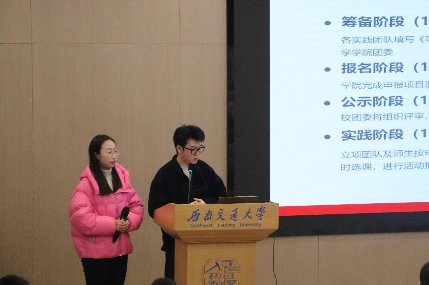 团建中心王星阳与青年志愿者协会杨越溪共同宣讲寒假“返家乡”社会实践活动的相关事宜。王星阳从申报流程、 av解说