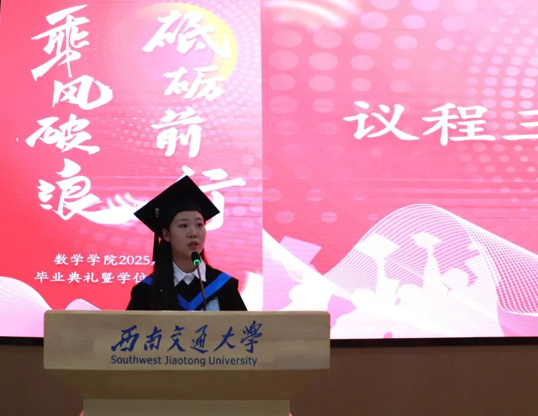 硕士毕业生代表李书婷发言,她回顾了从学术懵懂到掌握独立思考与研究能力的淬炼历程,深情感谢导师指引与同窗情谊,并祝福同学们脚下道路宽广,心中灯火长明,在星辰大海中乘风破浪、前程似锦。