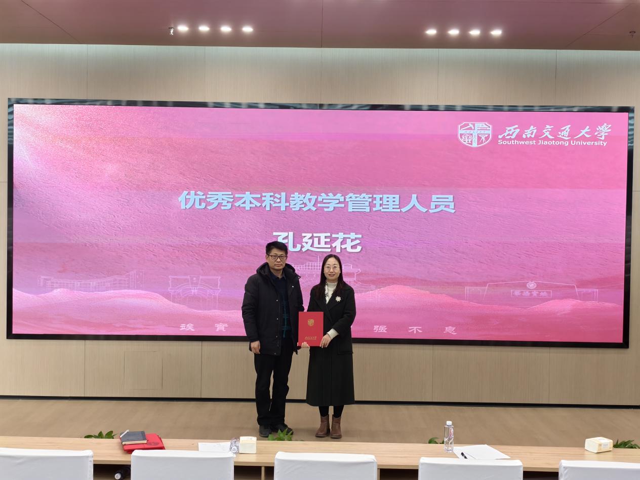 党委书记李志辉为优秀本科教学管理人员孔延花颁奖