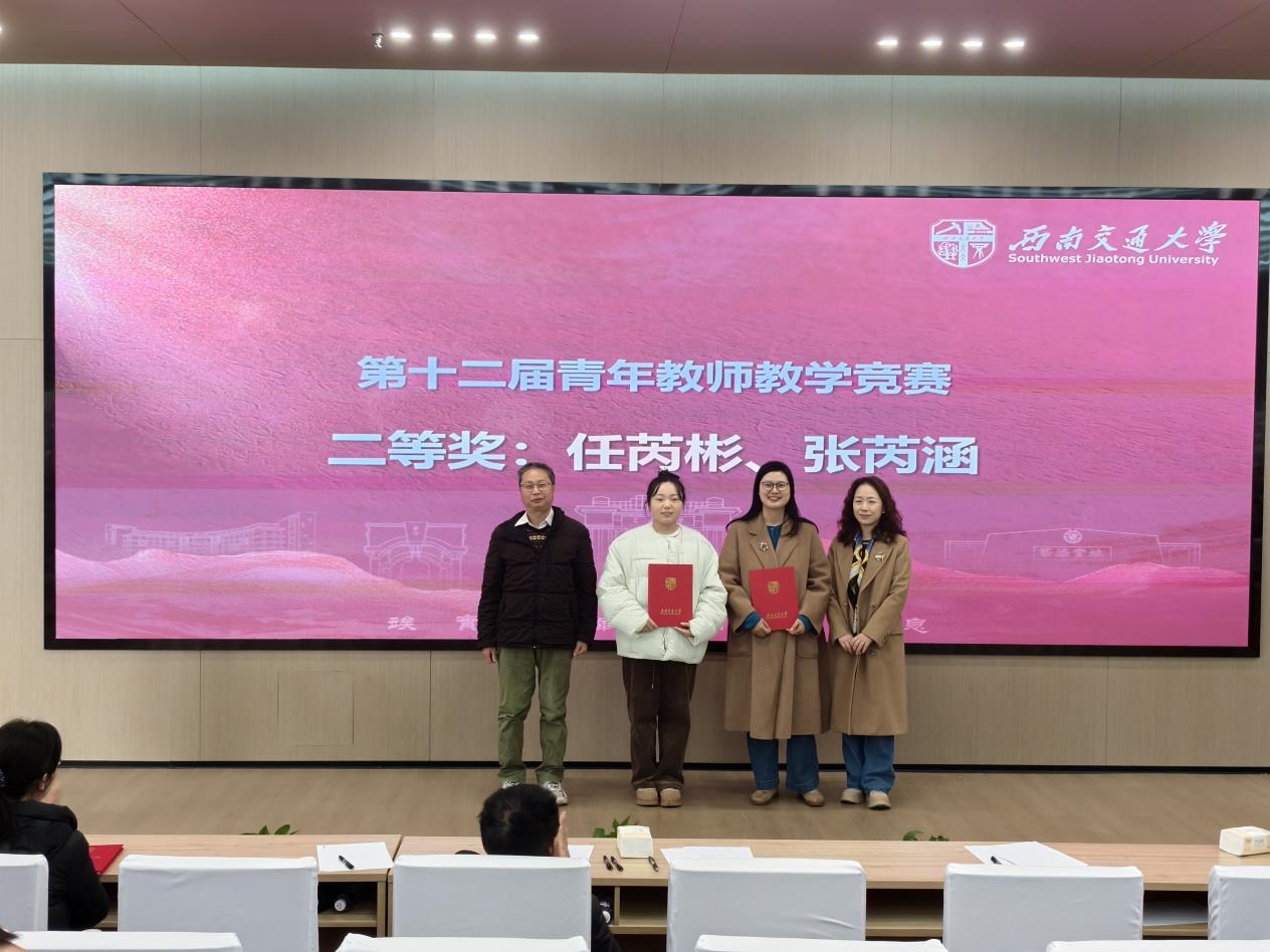 督导专家刘赪、数学学习中心主任樊明书为第十二届青年教师教学竞赛二等奖获得者任芮彬、张芮涵颁奖
