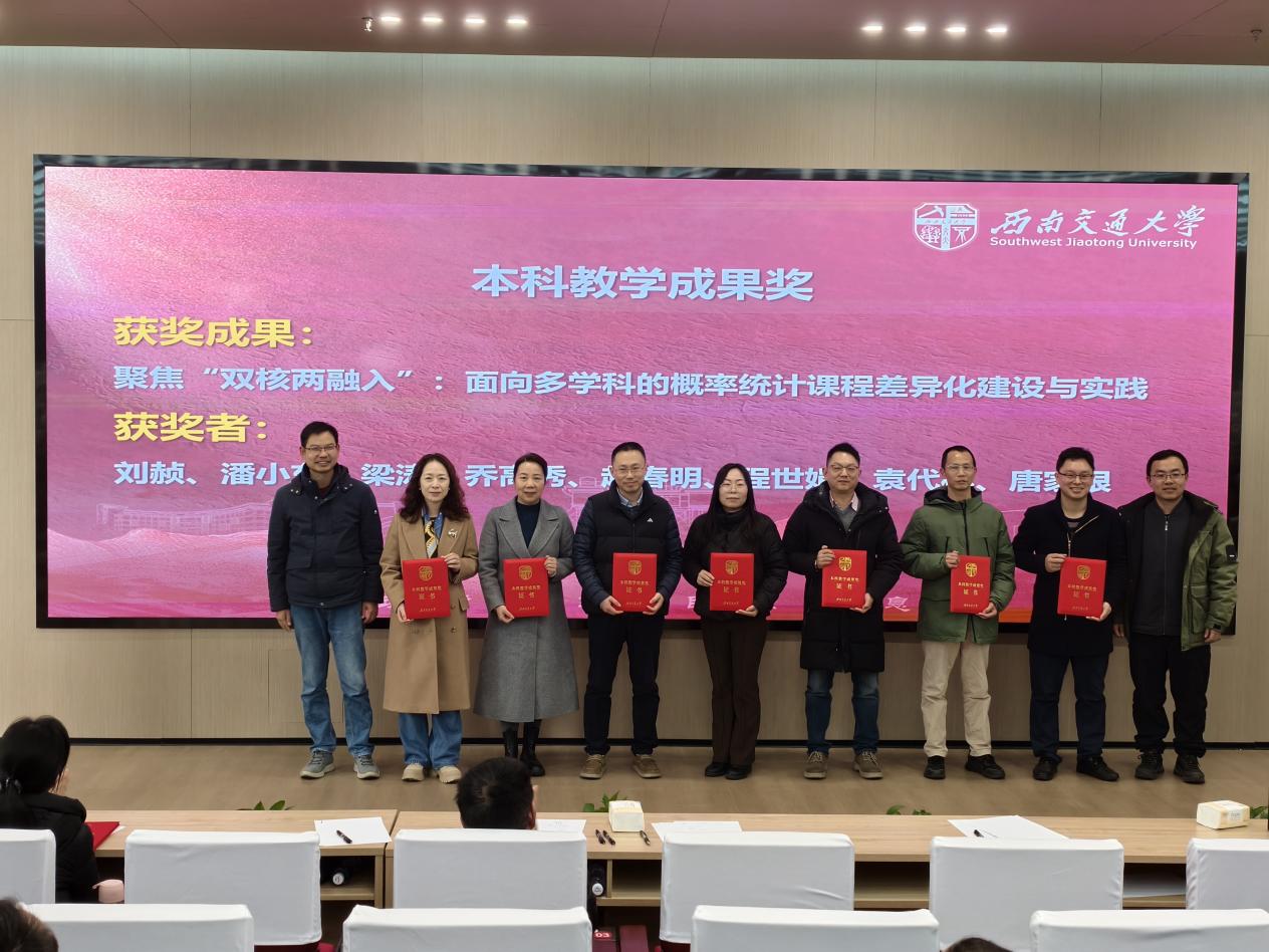 副院长杨洋、统计系主任黄磊为获奖成果“聚焦‘双核两融入’:面向多学科的概率统计课程差异化建设与实践”颁奖