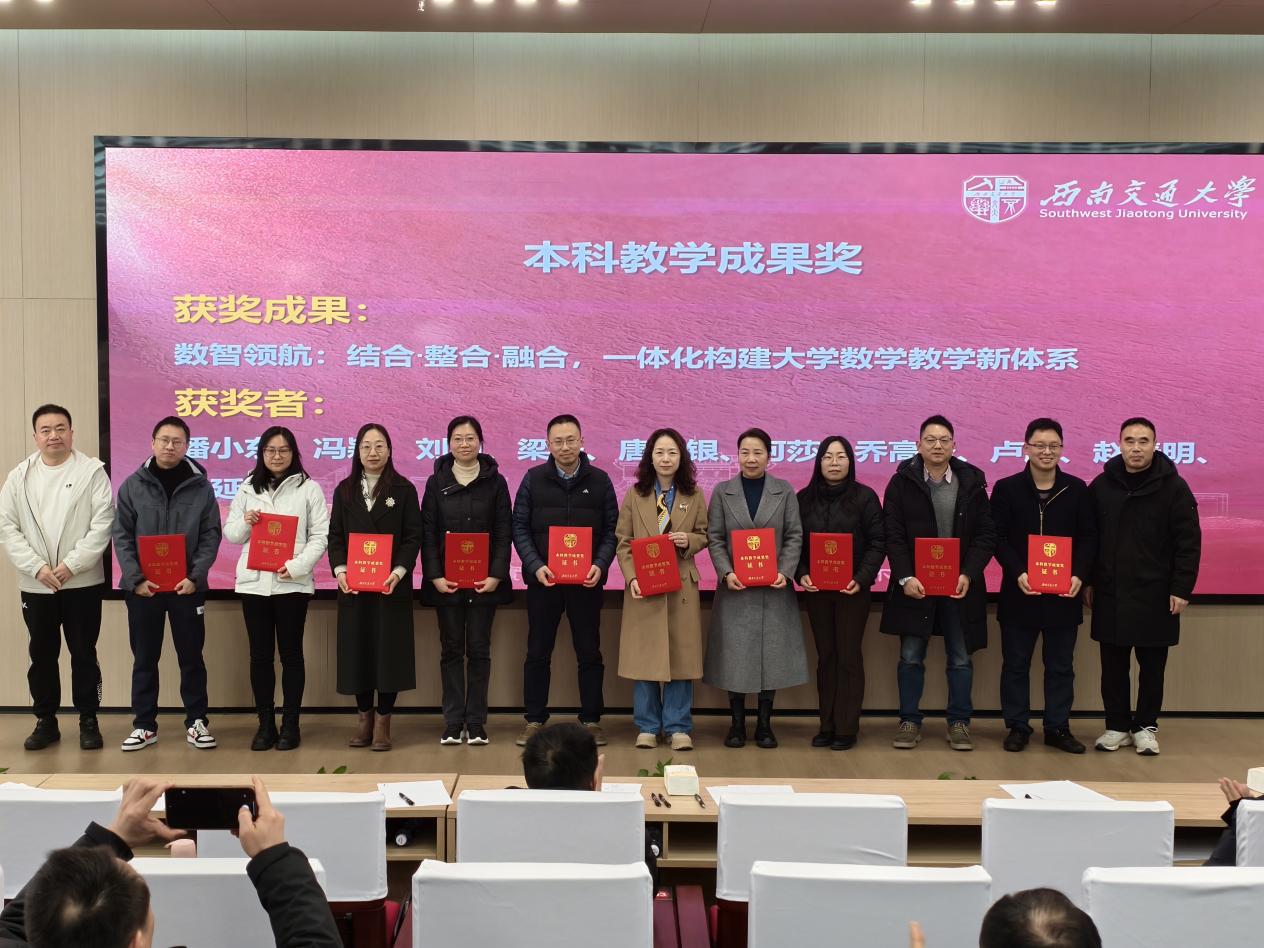 党委副书记黄祥、督导专家秦应兵为获奖成果“数智领航:结合·整合·融合,一体化构建大学数学教学新体系”颁奖