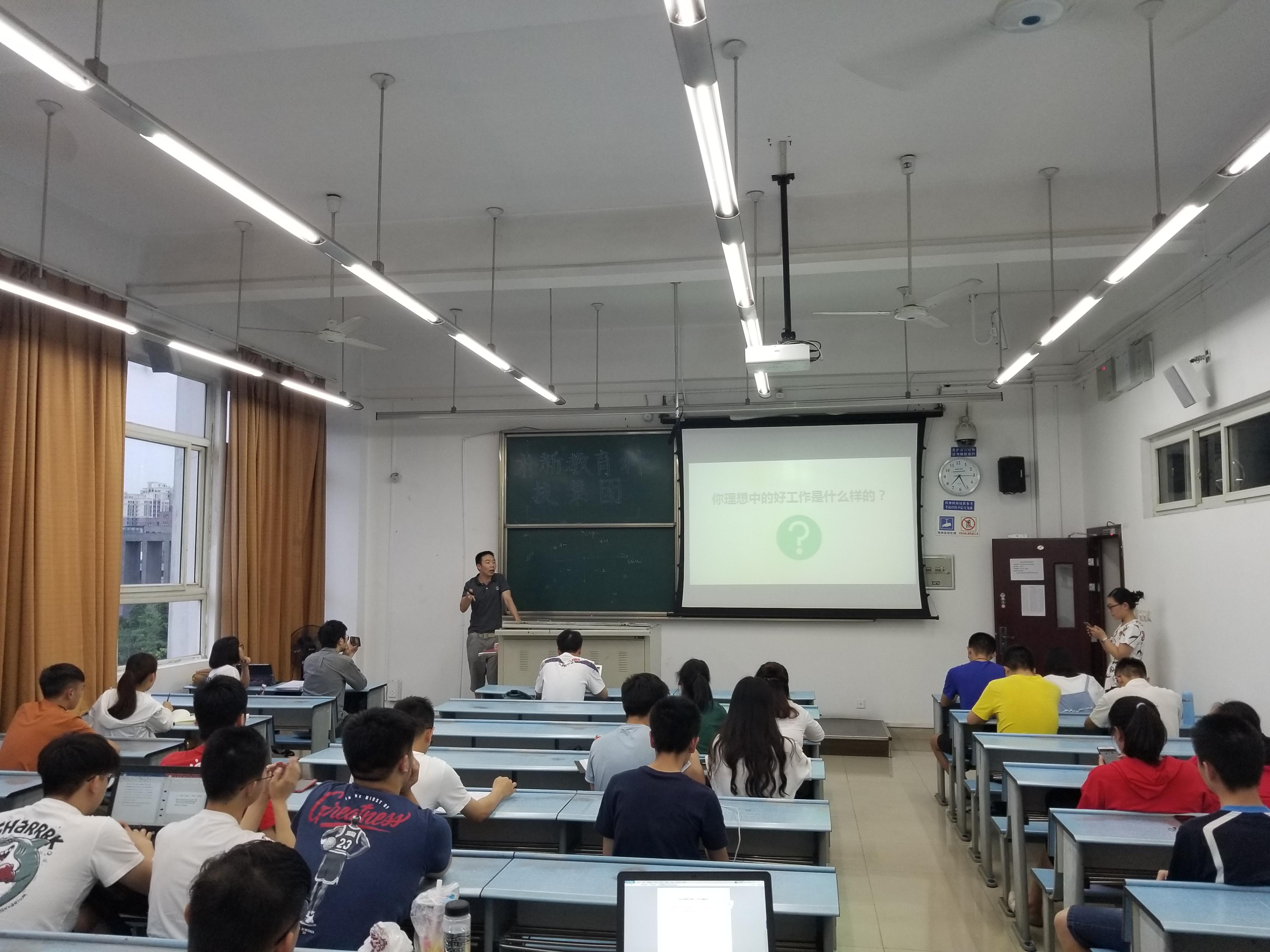 开讲前,解老师首先运用几个简单的问题迅速引起了同学们的注意,让同学们的思想迅速集中到“就业”这一关键问题上。解老师运用生动的语言和形象的实例向同学们普及了当前就业形势,并向同学们重点强调了个人能力和职业选择的重要性。