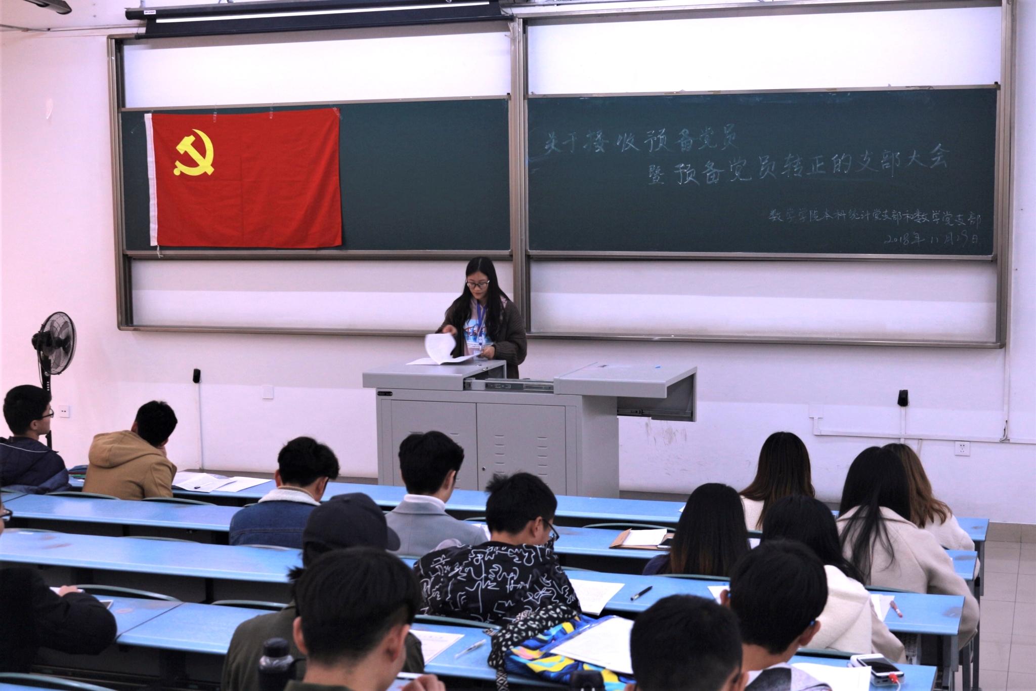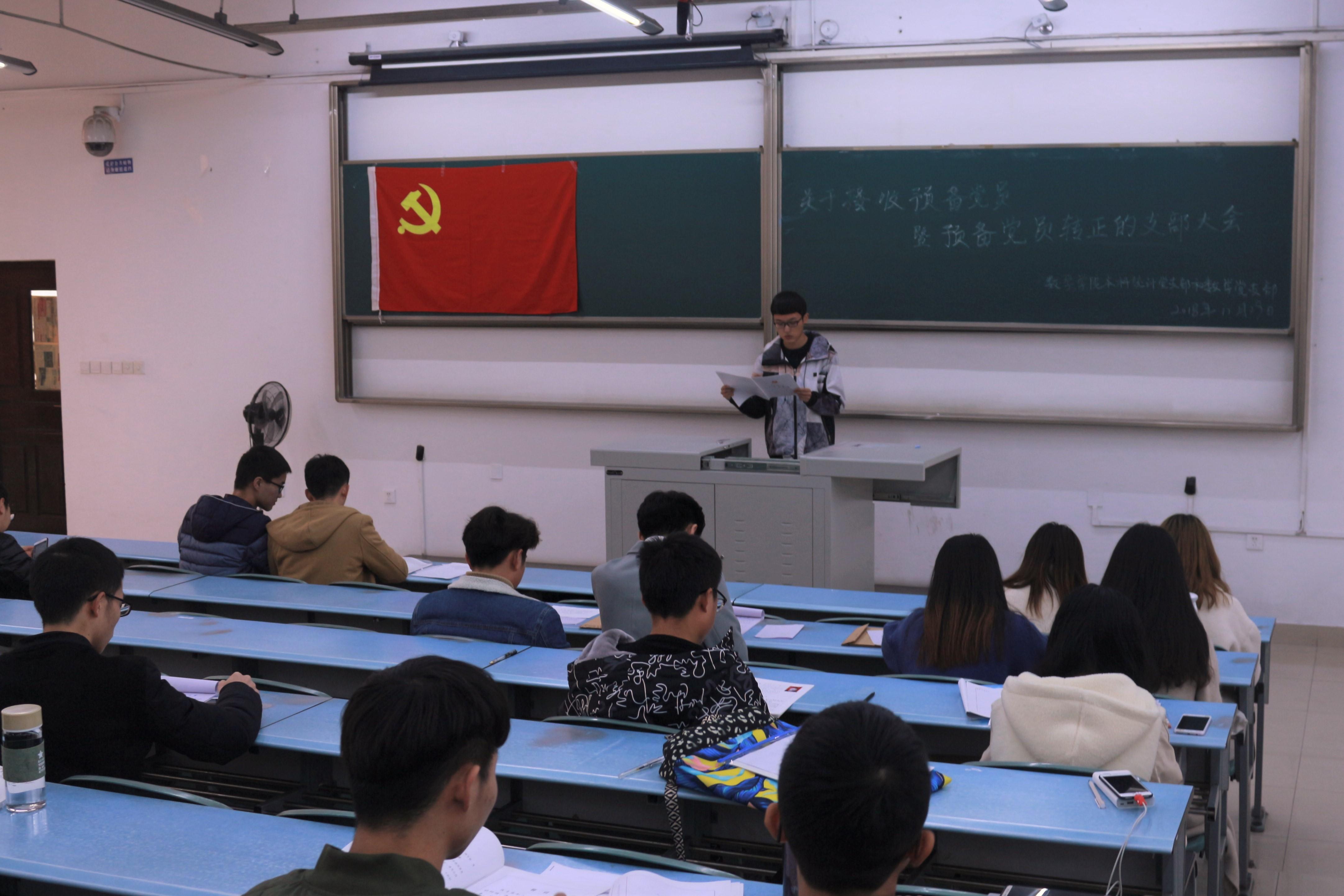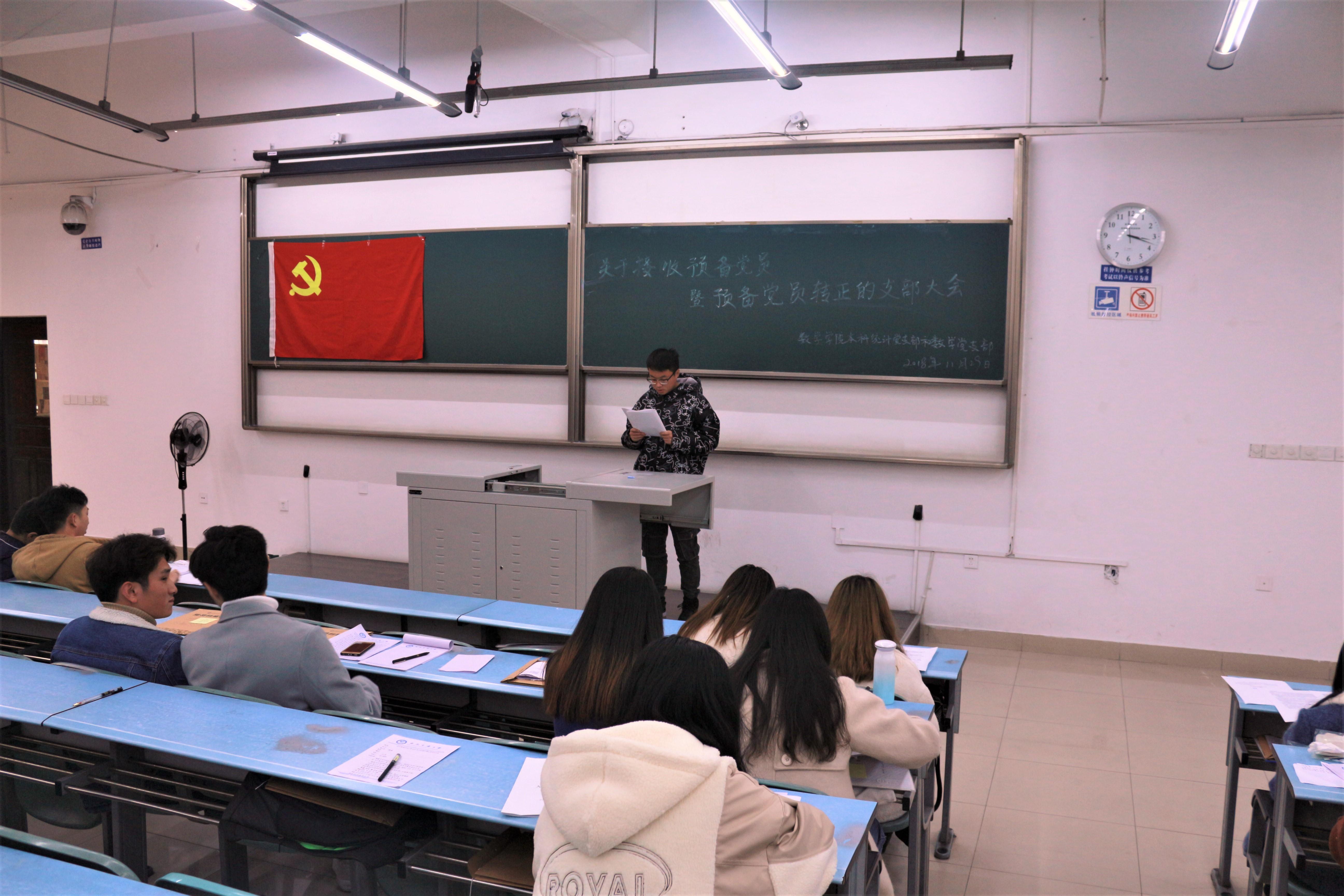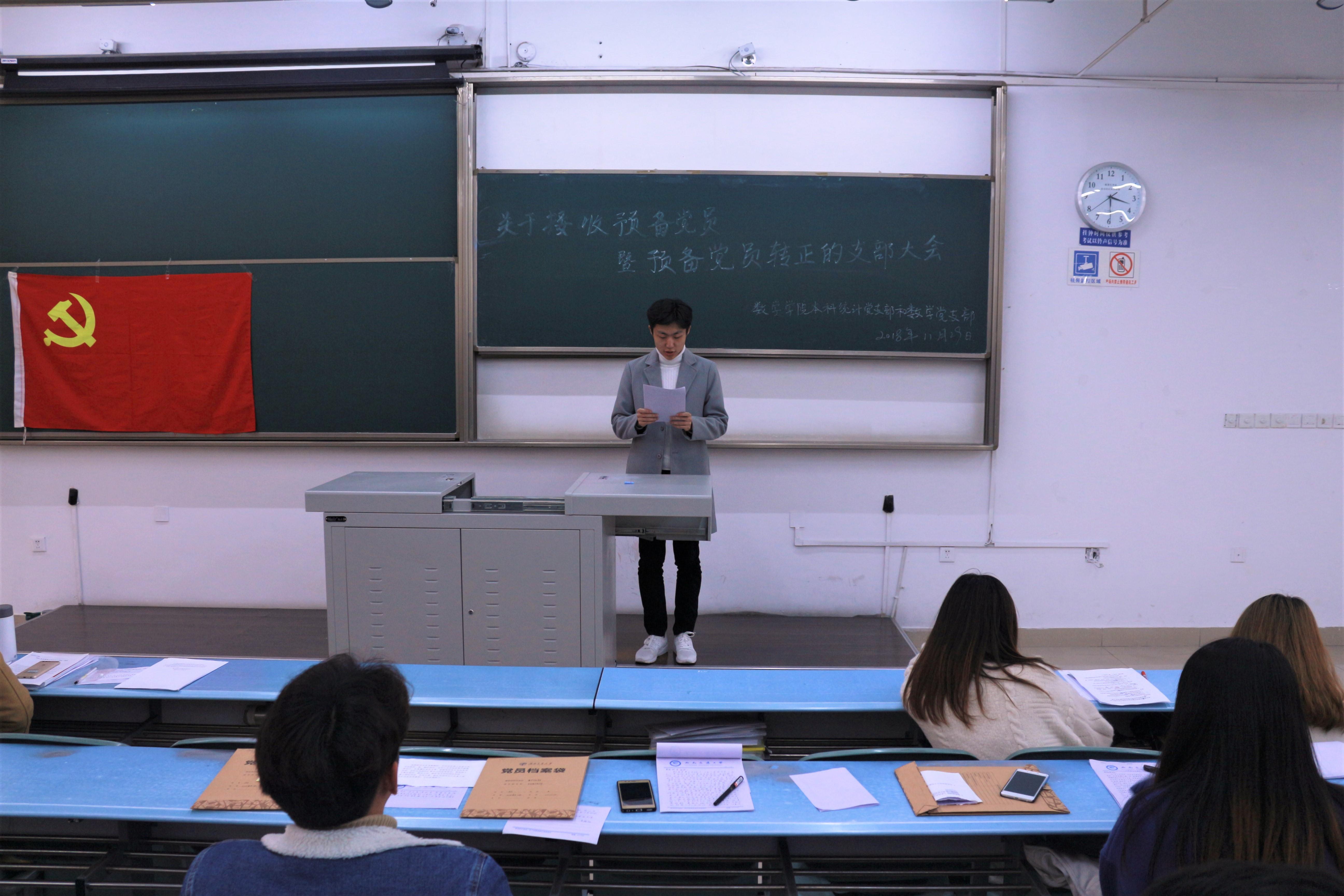 此次大会旨在进行接收预备党员和预备党员转正等相关事宜。大会正式开始后,主持人介绍了此次会议的流程,大会第一项内容是由组织委员宣布与会人员情况。参加此次大会的有数学党支部和统计党支部书记、各正式党员、预备党员和入党积极分子。