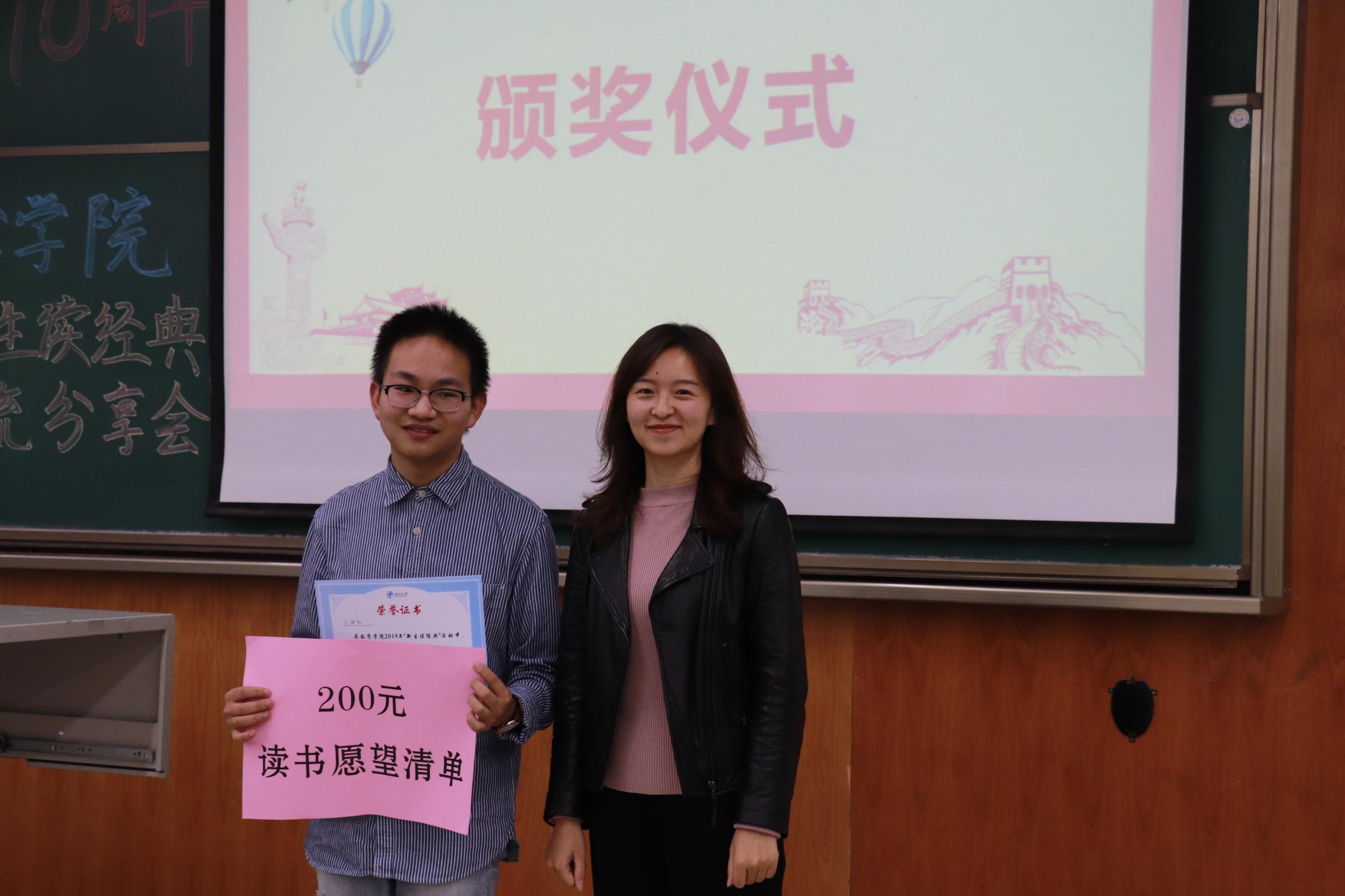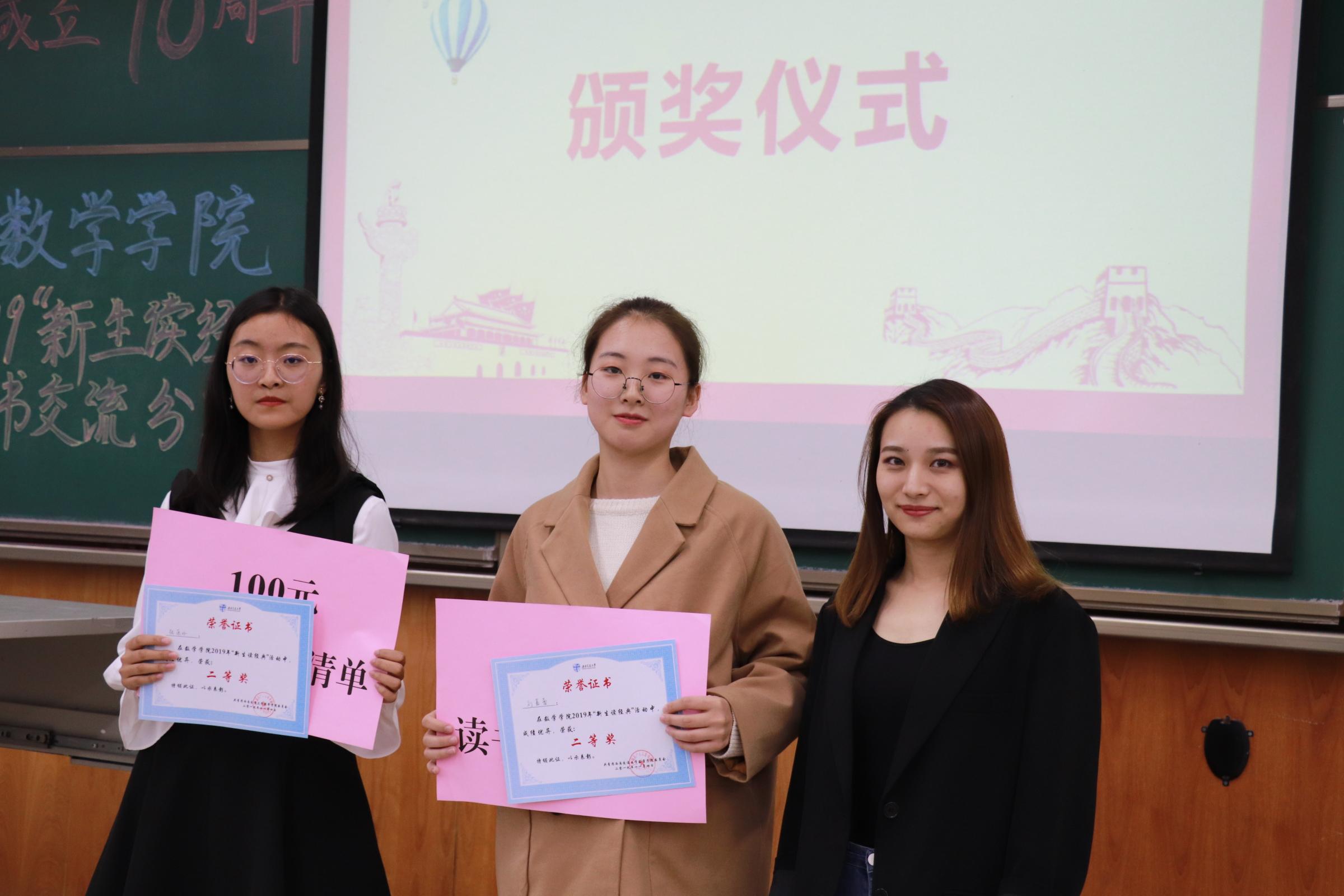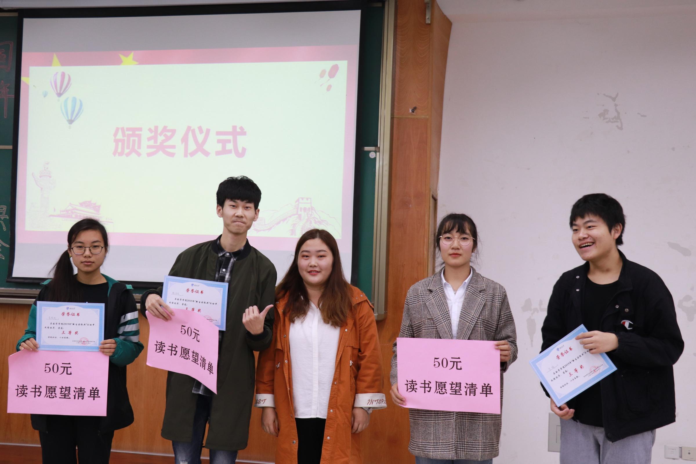 经过评委们的商讨,最终统计一班王继凯获得一等奖,统计一班刘嘉蕾、张潇丹获得二等奖,获得三等奖的同学是大数据一班毕辉、李昱欣,应数二班杨淳尧,获得最佳风尚奖的同学为统计一班葛田田、叶茂杰、张怡晨,应数一班张泊远。在同学们热烈的掌声中,“新生读经典”读书交流分享会圆满结束。