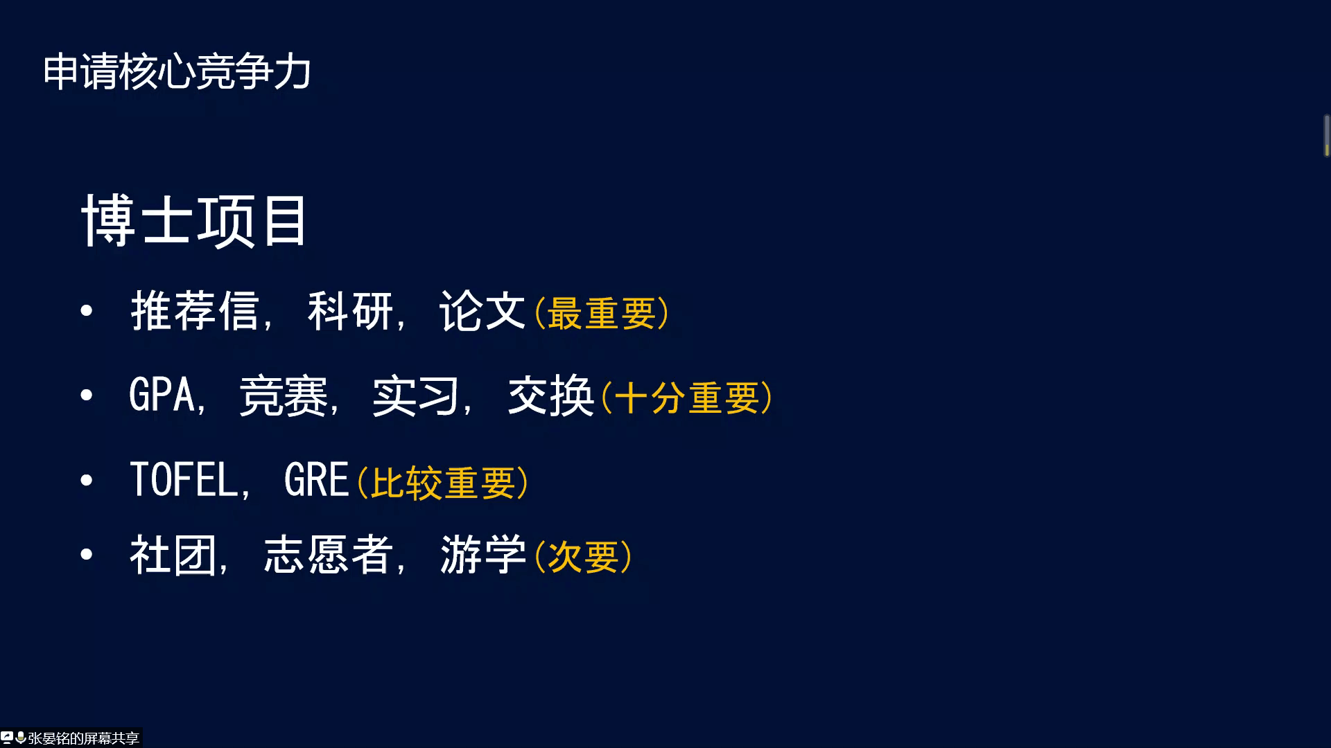 之后,即将前往美国纽约州立大学石溪分校留学的张晏铭同学与同学们分享了赴美留学的经验。首先,从申请条件入手,他认为学生的核心竞争力首先是GPA、TOFEL和GRE,其次是科研、竞赛、实习、交换经历,最后是学生组织、社团、志愿者以及游学等活动经历。最后张同学介绍了选择 av解说