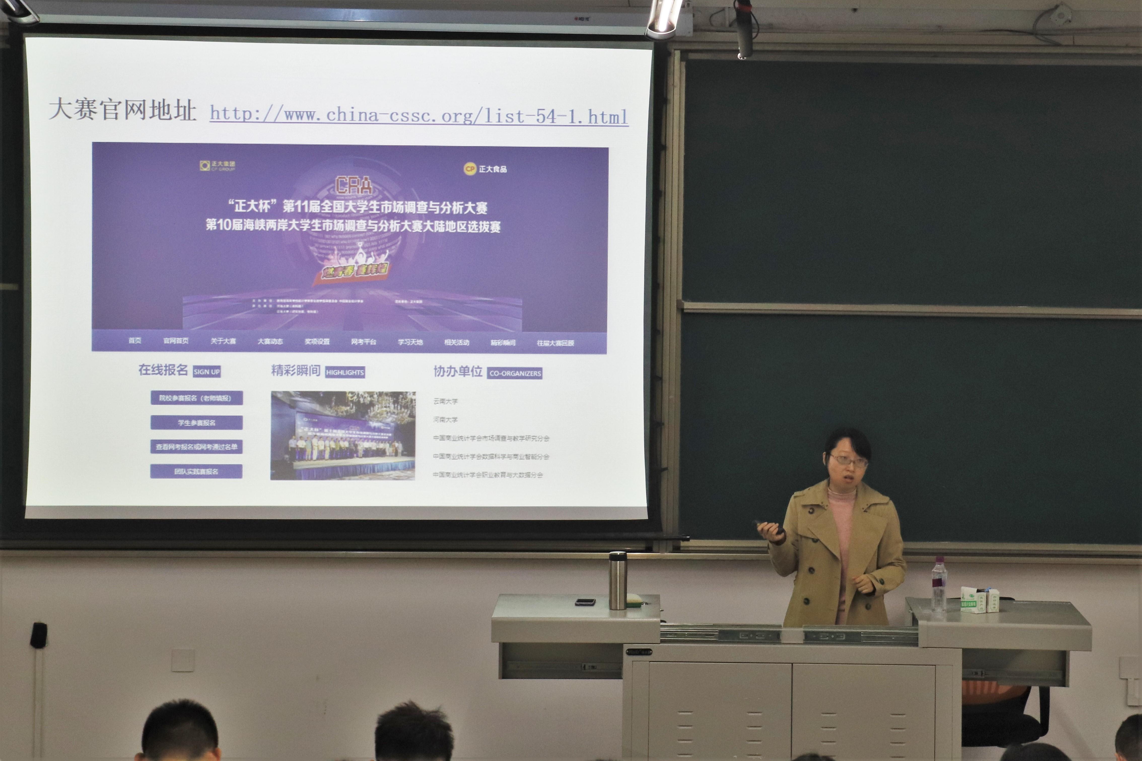 杨颖惠老师为大家带来关于第十一届市场调查与分析大赛的经验分享。杨老师从比赛概况、比赛特点、赛制流程等方面详细介绍了市场调查与分析大赛,并为同学们列出了详细的参赛规划。她还展示了在今年海峡两岸大学生市调大赛中斩获亚军队伍的参赛视频,供同学们学习参考。