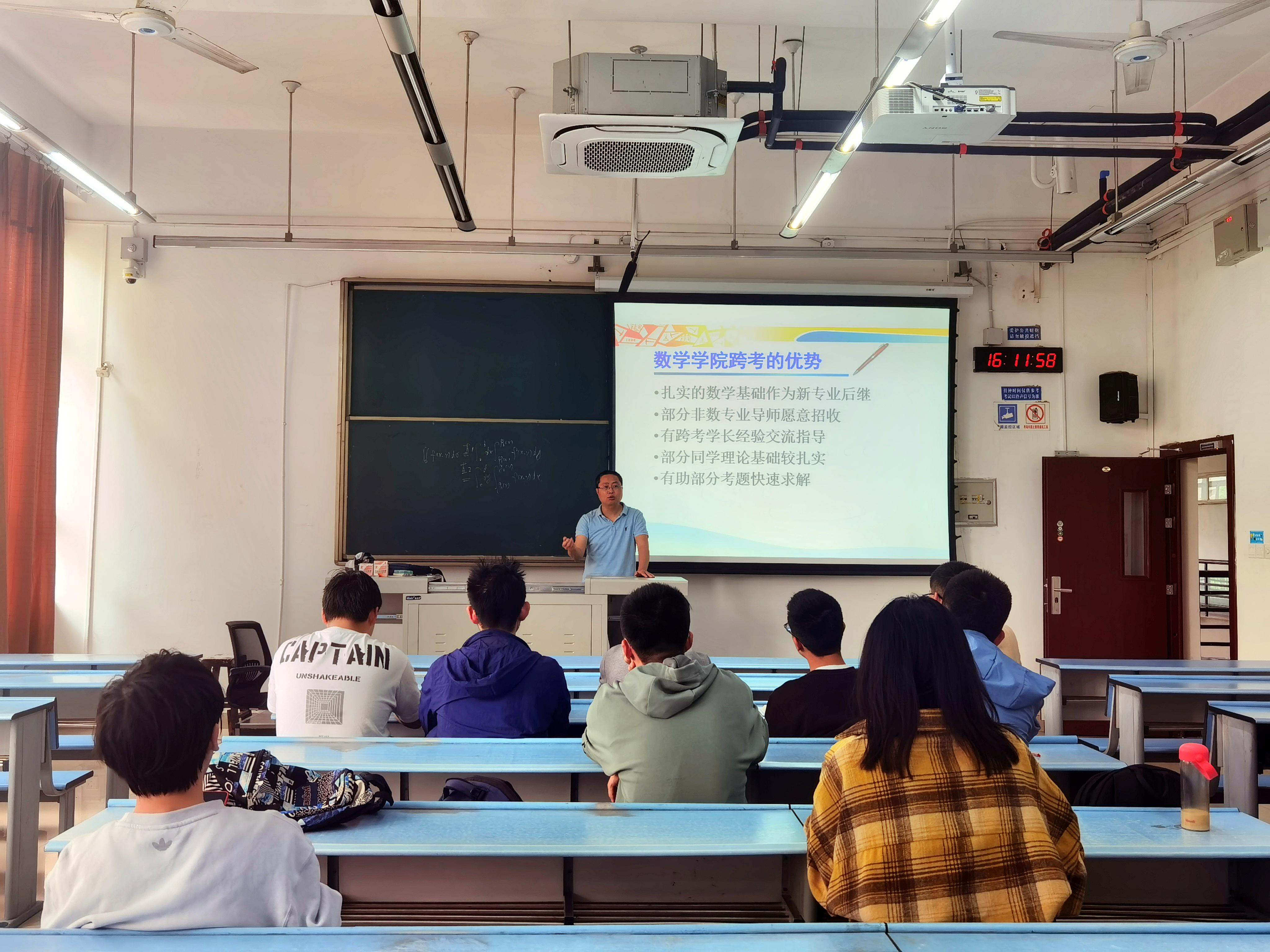 的学生跨考非数学专业的优势和劣势,并着重强调虽然数学专业的学生有扎实的数学基础和理论基础,但是这容易使学生产生心理误区和复习资料选择误区,并可能会导致复习方式上出现错误。他建议同学们一定要客观进行选择,在复习时应多做多练,同时学会观察他人的错误并以此来进行自我检查,从而得到提升。之后,樊明书老师分别介绍了升学的三大途径,同时还鼓励各位同学以积极的心态学习数学。讲座最后为提问环节,同学们积极地向樊明书老师提出了各自的问题,老师也认真耐心地为同学们解答疑难,提出建议。