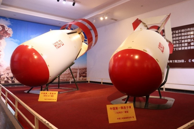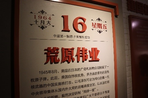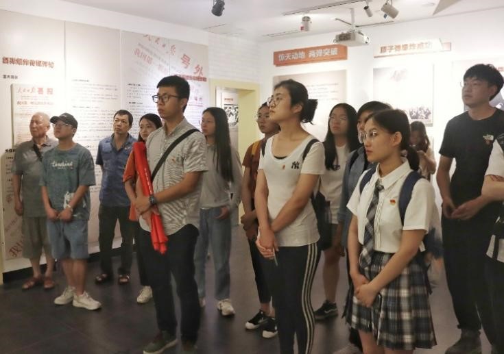 师生展现着“两弹”研制工作的艰辛历程。最后,师生们参观了两弹模型。讲解员介绍道:“这是我国第一颗核航弹的模型,长3米,直径1.5米左右,后面就是它爆炸所产生的蘑菇云。”师生们伴随着讲解,近距离感受科学家为两弹事业所做的伟大贡献。