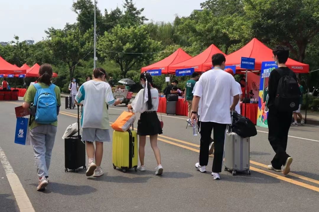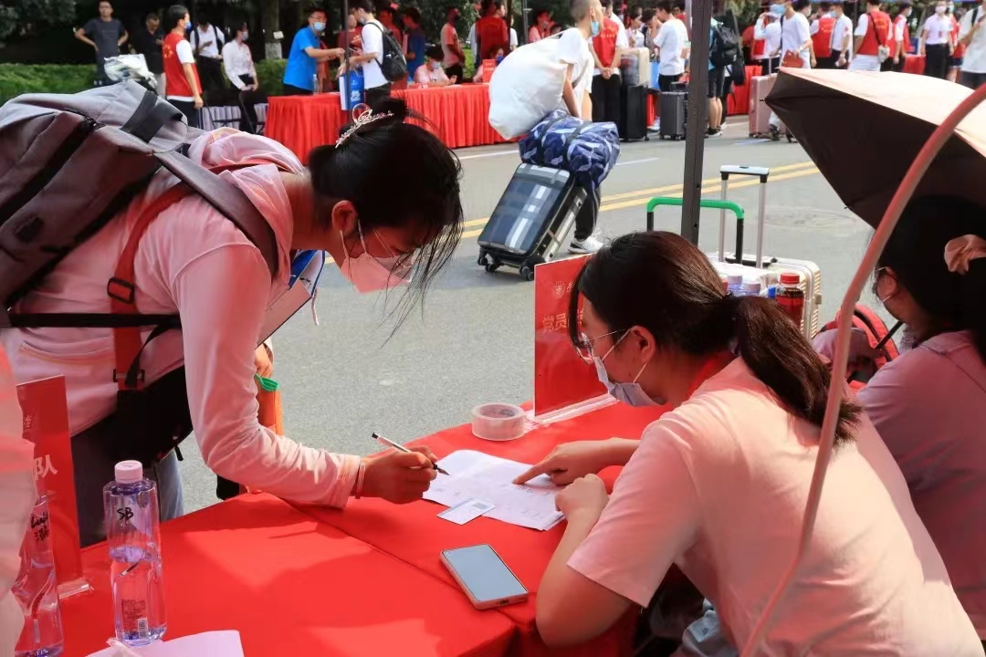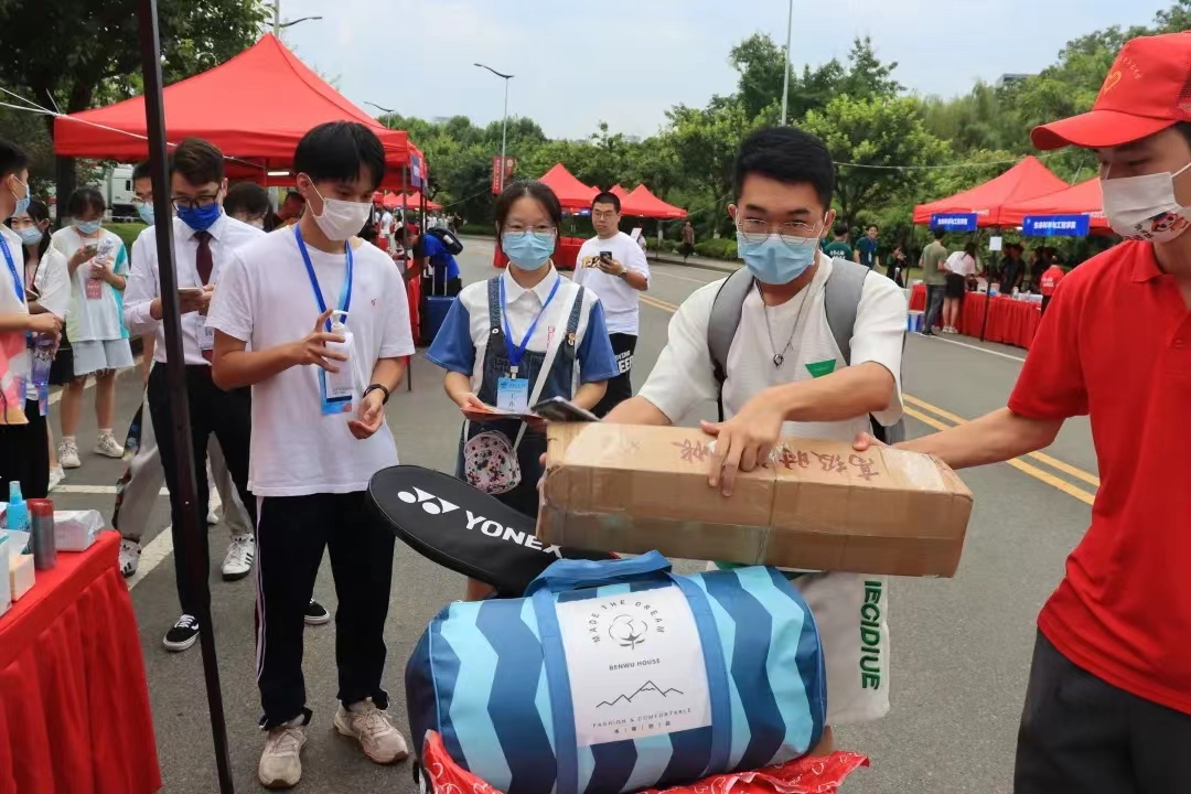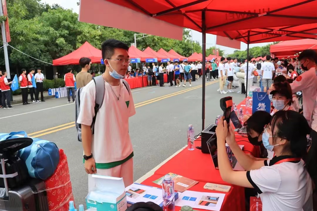 上午8时,随着第一批新生踏入迎新点,志愿者们便开始热情地引导新生们按规定流程进行报到。为落实疫情防控要求,新生们在志愿者的引导下有序排队进入迎新点,完成信息核验、网上确认、线下确认、物资领取等各项报到流程,随后在志愿者的引领下乘坐摆渡车前往北区宿舍。