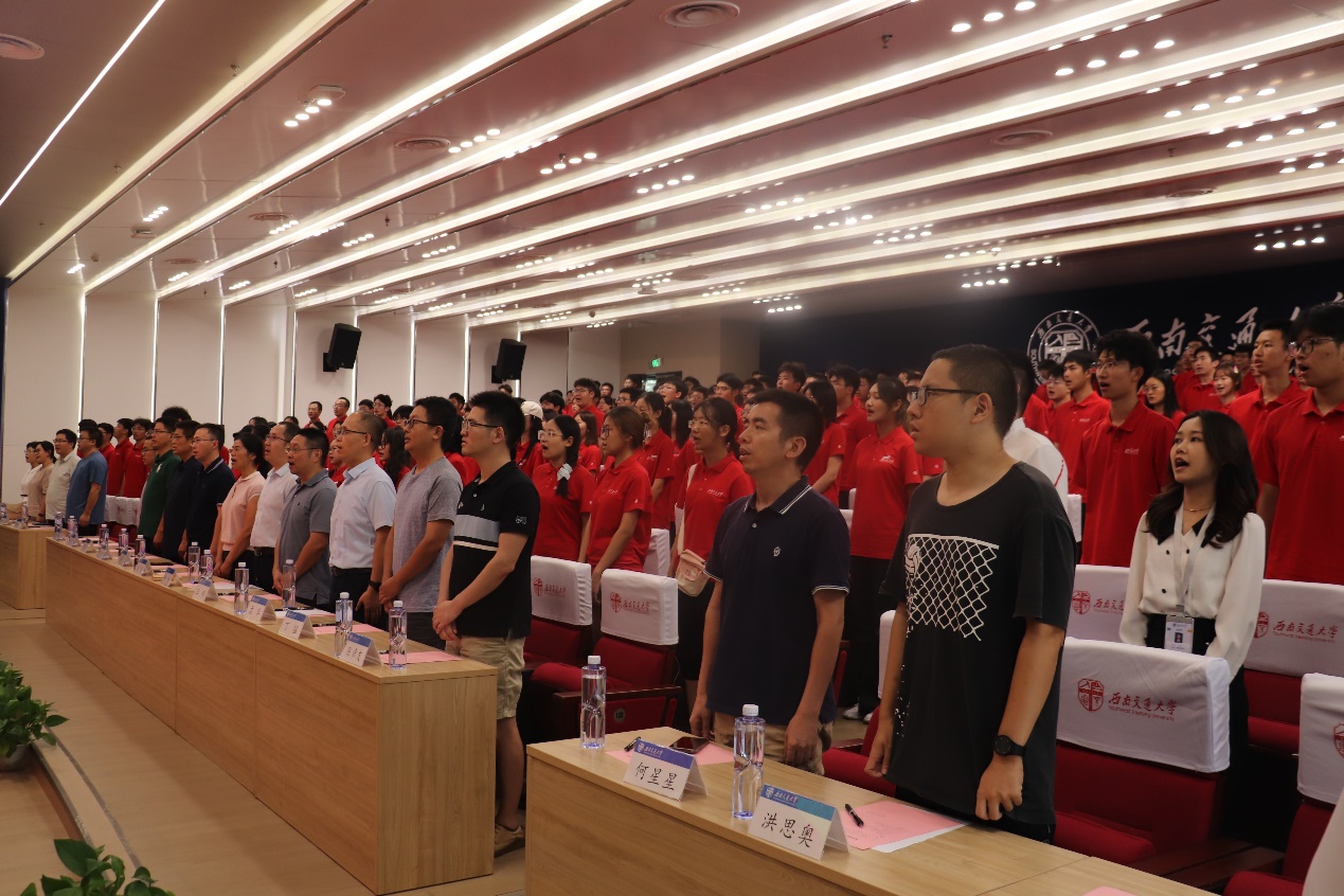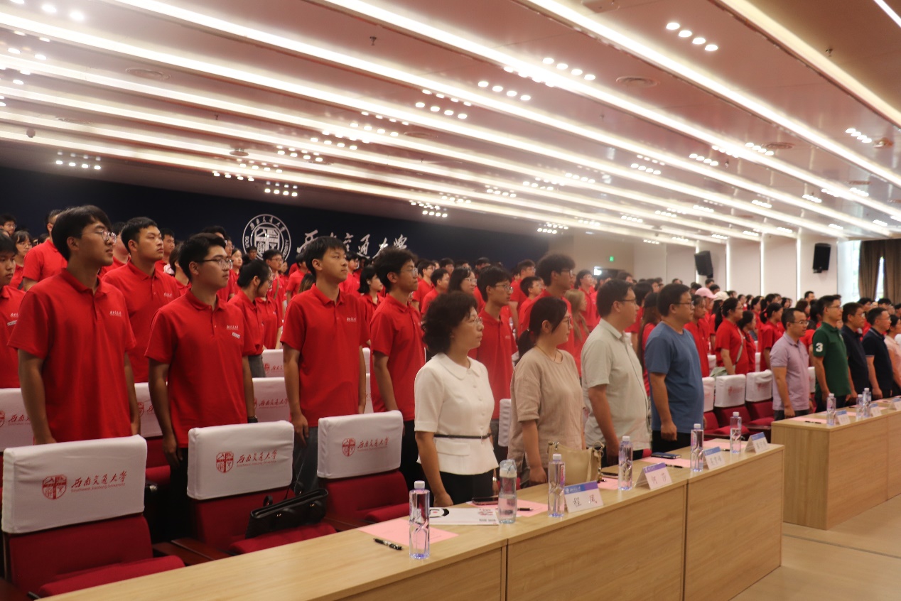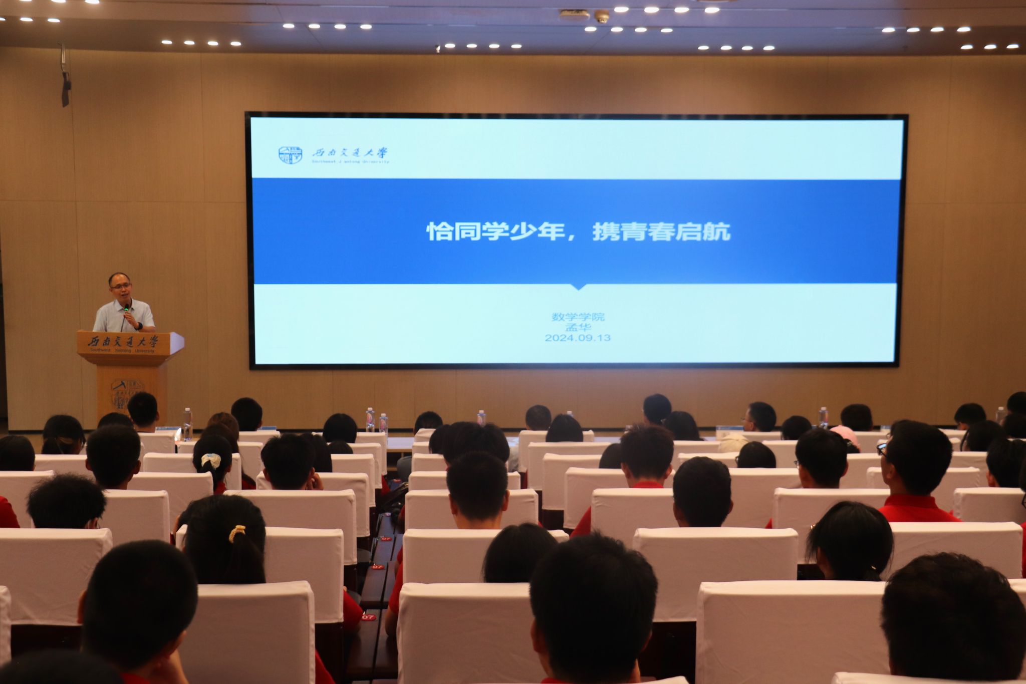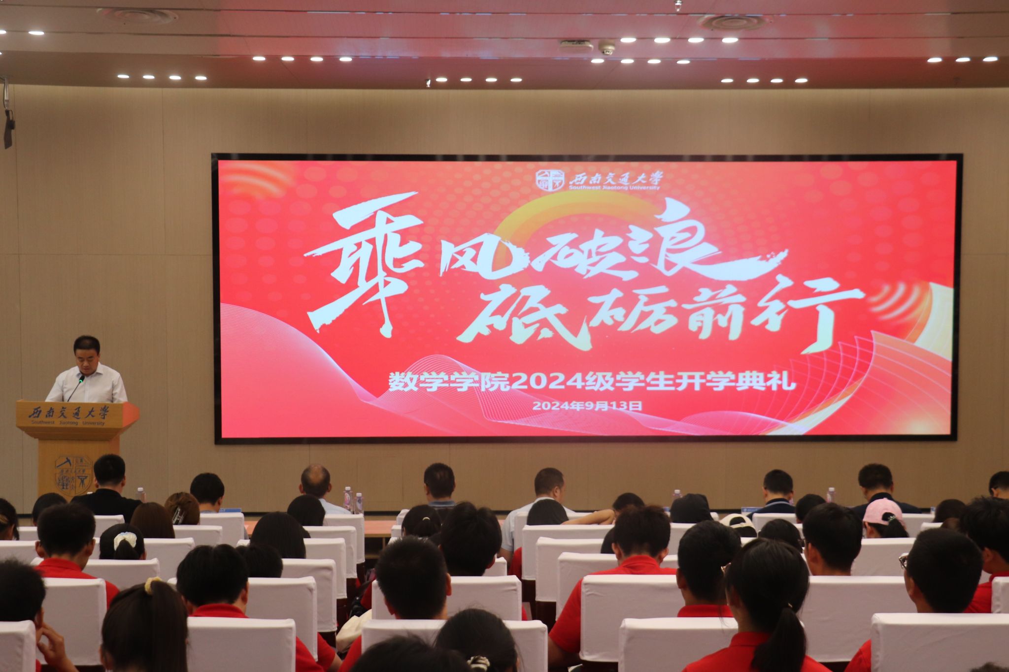 9月13日下午2时30分, av解说 2024级学生开学典礼在犀浦校区图书馆二号报告厅隆重举行。出席会议的嘉宾有 av解说 党委书记徐革教授、院长杨晗教授、副院长潘小东副教授、副院长王璐教授、副院长李志辉副教授、信息与计算科学系杨洋教授、信息与计算科学系主任孟华副教授、统计系黄磊副教授、数学2024-01班班导师崔宁伟、数学2024-01班班导师吴贯锋、统计2024-02班班导师何莎、统计2024-02班班导师程凤、大数据2024-01班班导师何星星、大数据2024-01班班导师洪思奥、大数据2024-02班班导师陈章友、大数据2024-02班班导师丁猛、团委书记张素子及全体学工组老师。会议由 av解说 党委副书记黄祥主持。
